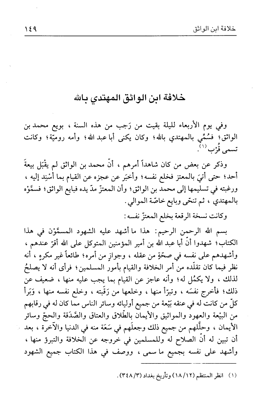 بسم الله الرحمن الرحيم: هذا ما أشهد عليه الشهود المسمَّوْن في هذا الكتاب؛ شهدوا أنّ أبا عبد الله بن أمير المؤمنين المتوكل على الله أقرّ عندهم، وأشهدهم على نفسه في صحّةٍ من عقله، وجوازٍ من أمره؛ طائعًا غير مكره، أنه نظر فيما كان تقلّده من أمر الخلافة والقيام بأمور المسلمين؛ فرأى أنه لا يصلحُ لذلك، ولا يكمُل له؛ وأنه عاجز عن القيام بما يجب عليه منها، ضعيف عن ذلك؛ فأخرج نفسَه، وتبرّأ منها، وخلعها من رَقَبته، وخلع نفسه منها، وَبَرأ كلّ من كانت له في عنقه بَيْعة من جميع أوليائه وسائر الناس مما كان له في رقابهم من البيْعة والعهود والمواثيق والأيمان بالطّلاق والعتاق والصَّدَقة والحجّ وسائر الأيمان، وحلَّلهم من جميع ذلك وجعلَهم في سَعَة منه في الدنيا والآخرة، بعد أن تبين له أنّ الصلاح له وللمسلمين في خروجه عن الخلافة والتبرؤ منها، وأشهد على نفسه بجميع ما سمى، ووصف في هذا الكتاب جميع الشهود