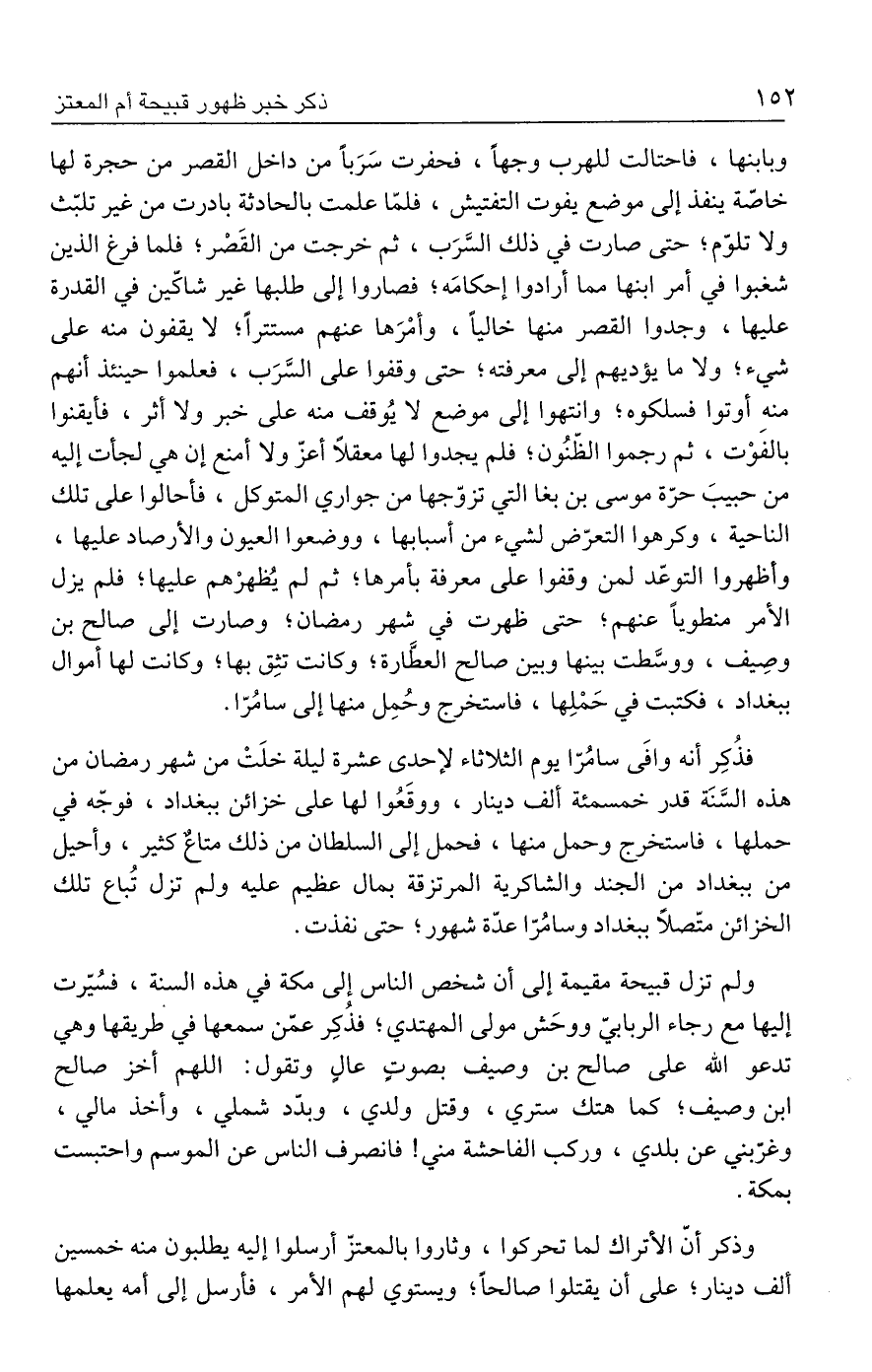 وبابنها، فاحتالت للهرب وجهًا، فحفرت سَرَبًا من داخل القصر من حجرة لها خاصّة ينفذ إلى موضع يفوت التفتيش، فلمّا علمت بالحادثة بادرت من غير تلبّث ولا تلوّم؛ حتى صارت في ذلك السَّرَب، ثم خرجت من القَصْر؛ فلما فرغ الذين شغبوا في أمر ابنها مما أرادوا إحكامَه؛ فصاروا إلى طلبها غير شاكّين في القدرة عليها، وجدوا القصر منها خاليًا، وأمْرَها عنهم مستترًا؛ لا يقفون منه على شيء؛ ولا ما يؤديهم إلى معرفته؛ حتى وقفوا على السَّرَب، فعلموا حينئذ أنهم منه أوتوا فسلكوه؛ وانتهوا إلى موضع لا يُوقف منه على خبر ولا أثر، فأيقنوا بالفَوْت، ثم رجموا الظّنُون؛ فلم يجدوا لها معقلًا أعزّ ولا أمنع إن هي لجأت إليه من حبيبَ حرّة موسى بن بغا التي تزوّجها من جواري المتوكل، فأحالوا على تلك الناحية، وكرهوا التعرّض لشيء من أسبابها، ووضعوا العيون والأرصاد عليها، وأظهروا التوعّد لمن وقفوا على معرفة بأمرها؛ ثم لم يُظهرْهم عليها؛ فلم يزل الأمر منطويًا عنهم؛ حتى ظهرت في شهر رمضان؛ وصارت إلى صالح بن وصِيف، ووسَّطت بينها وبين صالح العطَّارة؛ وكانت تثِق بها؛ وكانت لها أموال ببغداد، فكتبت في حَمْلِها، فاستخرج وحُمِل منها إلى سامُرّا.