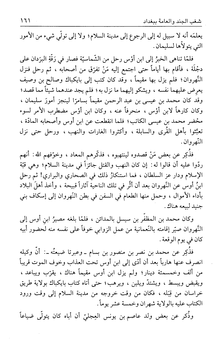 فذُكِر عن بعض مَنْ قصدوه لينتهبوه، فذكّرهم المعاد، وخوّفهم الله: أنهم ردّوا عليه أن قالوا له: إن كان النهب والقتل جائزًا في مدينة السلام؛ وهي قبّة الإسلام ودار عز السلطان، فما استنكارُ ذلك في الصحاري والبراري! ثم رحل ابنُ أوس عن النَّهروان بعد أن أثَّر في تلك الناحية آثارًا قبيحة، وأخذ أهلَ البلاد بأداء الأموال، وحمل منها الطعام في السفن في بطن النّهروان إلى إسكاف بني جنيد لبيعه هناك.