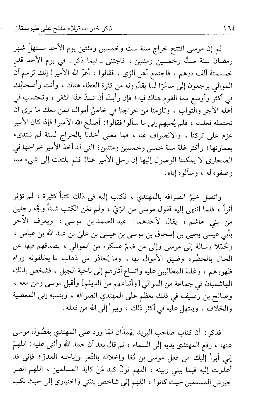 فذكر: أن كتاب صاحب البريد بهَمذَان لمّا ورد على المهتدي بفصُول موسى عنها، رفع المهتدي يديه إلى السماء، ثم قال بعد أن حمد الله وأثنى عليه: اللهمّ إني أبرأ إليك من فعل موسى بن بُغا وإخلاله بالثّغر وإباحته العدوّ؛ فإني قد أعذرت إليه فيما بيني وبينه، اللهم تولّ كيد مَنْ كايد المسلمين، اللهم انصر جيوش المسلمين حيث كانوا، اللهم إني شاخص بنيّتي واختياري إلى حيث نكب