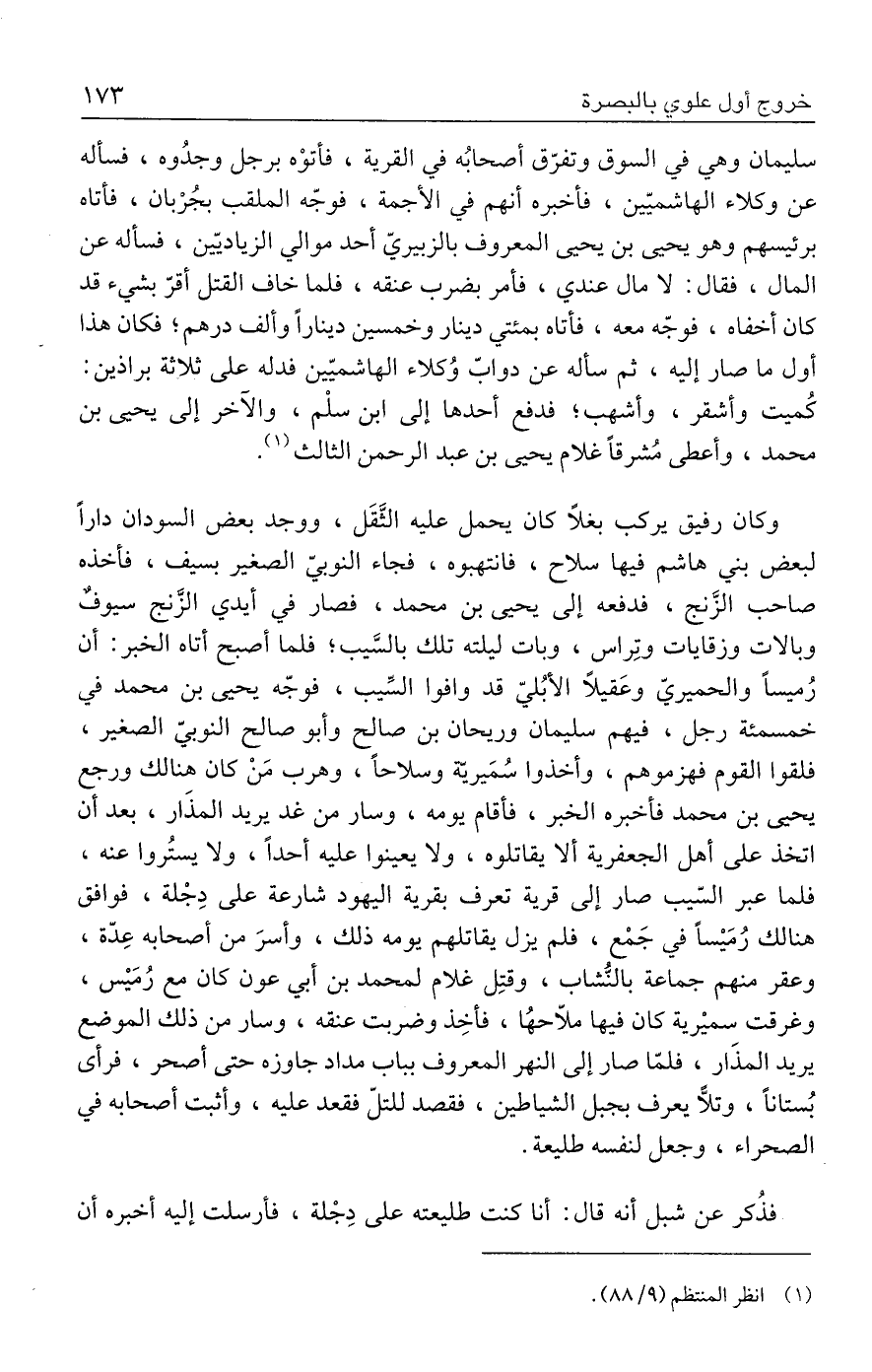 سليمان وهي في السوق وتفرّق أصحابُه في القرية، فأتوْه برجل وجدُوه، فسأله عن وكلاء الهاشميّين، فأخبره أنهم في الأجمة، فوجّه الملقب بجُرْبان، فأتاه برئيسهم وهو يحيى بن يحيى المعروف بالزبيريّ أحد موالي الزياديّين، فسأله عن المال، فقال: لا مال عندي، فأمر بضرب عنقه، فلما خاف القتل أقرّ بشيء قد كان أخفاه، فوجّه معه، فأتاه بمئتي دينار وخمسين دينارًا وألف درهم؛ فكان هذا أول ما صار إليه، ثم سأله عن دوابّ وُكلاء الهاشميّين فدله على ثلاثة براذين: كُميت وأشقر، وأشهب؛ فدفع أحدها إلى ابن سلْم، والآخر إلى يحيى بن محمد، وأعطى مُشرقًا غلام يحيى بن عبد الرحمن الثالث (١).