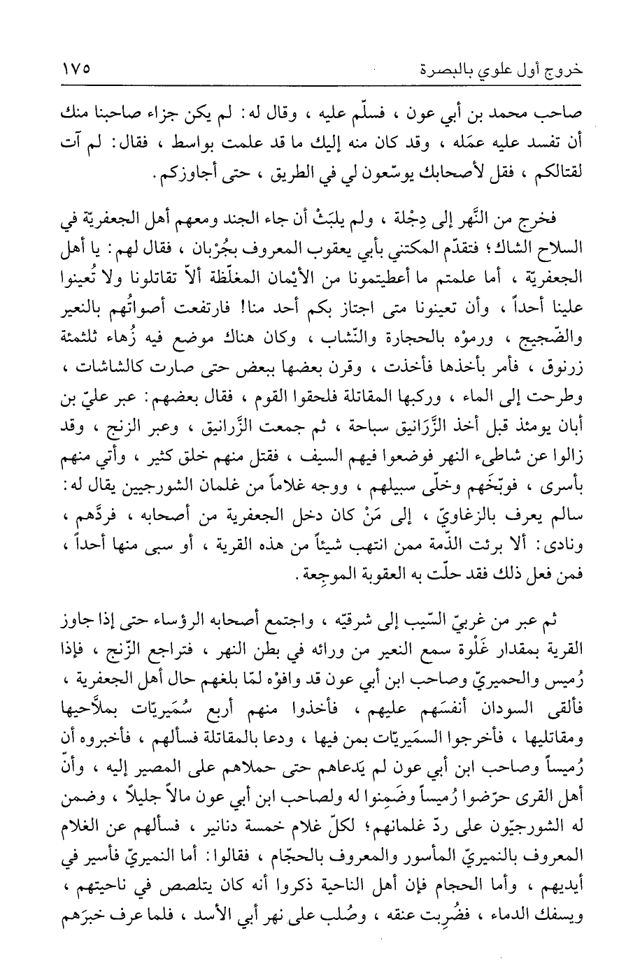 ثم عبر من غربيّ السّيب إلى شرقيّه، واجتمع أصحابه الرؤساء حتى إذا جاوز القرية بمقدار غَلْوة سمع النعير من ورائه في بطن النهر، فتراجع الزّنج، فإذا رُميس والحميريّ وصاحب ابن أبي عون قد وافوْه لمّا بلغهم حال أهل الجعفرية، فألقى السودان أنفسَهم عليهم، فأخذوا منهم أربع سُمَيريّات بملَّاحيها ومقاتليها، فأخرجوا السمَيريّات بمن فيها، ودعا بالمقاتلة فسألهم، فأخبروه أن رُميسًا وصاحب ابن أبي عون لم يَدعاهم حتى حملاهم على المصير إليه، وأنّ أهل القرى حرّضوا رُميسًا وضَمِنوا له ولصاحب ابن أبي عون مالًا جليلًا، وضمن له الشورجيّون على ردّ غلمانهم؛ لكلّ غلام خمسة دنانير، فسألهم عن الغلام المعروف بالنميريّ المأسور والمعروف بالحجّام، فقالوا: أما النميريّ فأسير في أيديهم، وأما الحجام فإن أهل الناحية ذكروا أنه كان يتلصص في ناحيتهم، ويسفك الدماء، فضُرِبت عنقه، وصُلب على نهر أبي الأسد، فلما عرف خبرَهم