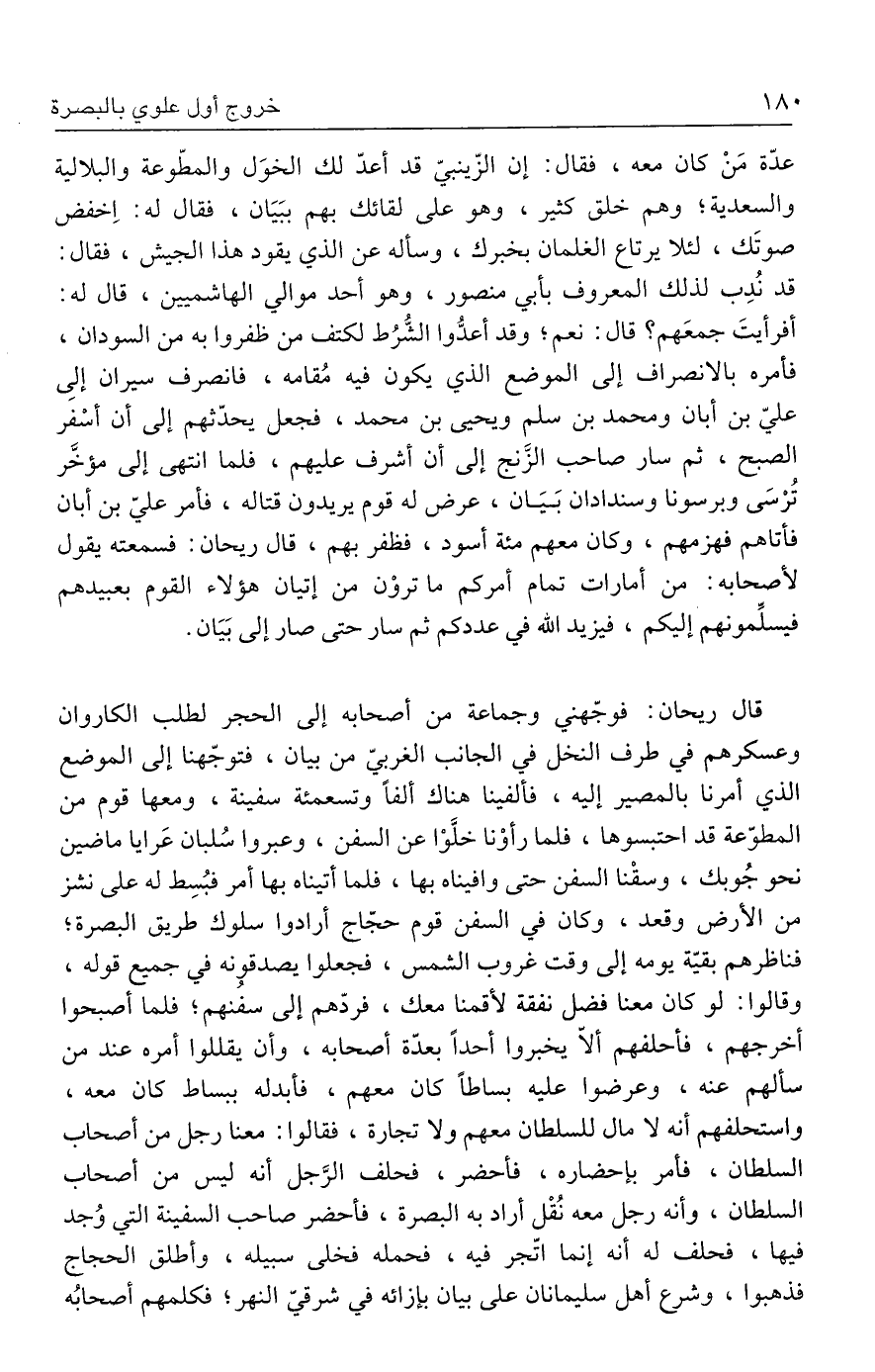 عدّة مَنْ كان معه، فقال: إن الزّينبيّ قد أعدّ لك الخوَل والمطّوعة والبلالية والسعدية؛ وهم خلق كثير، وهو على لقائك بهم ببَيَان، فقال له: اِخفض صوتَك، لئلا يرتاع الغلمان بخبرك، وسأله عن الذي يقود هذا الجيش، فقال: قد نُدِب لذلك المعروف بأبي منصور، وهو أحد موالي الهاشميين، قال له: أفرأيتَ جمعَهم؟ قال: نعم؛ وقد أعدُّوا الشُّرُط لكتف من ظفروا به من السودان، فأمره بالانصراف إلى الموضع الذي يكون فيه مُقامه، فانصرف سيران إلىِ عليّ بن أبان ومحمد بن سلم ويحيى بن محمد، فجعل يحدّثهم إلى أن أسْفر الصبح، ثم سار صاحب الزَّنج إلى أن أشرف عليهم، فلما انتهى إلى مؤخَّر تُرْسَى وبرسونا وسندادان بَيَان، عرض له قوم يريدون قتاله، فأمر عليّ بن أبان فأتاهم فهزمهم، وكان معهم مئة أسود، فظفر بهم، قال ريحان: فسمعته يقول لأصحابه: من أمارات تمام أمركم ما تروْن من إتيان هؤلاء القوم بعبيدهم فيسلِّمونهم إليكم، فيزيد الله في عددكم ثم سار حتى صار إلى بَيَان.