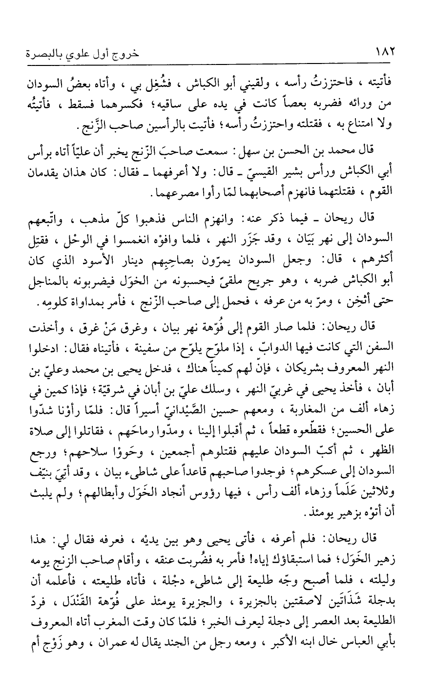 قال ريحان: فلم أعرفه، فأتى يحيى وهو بين يديْه، فعرفه فقال في: هذا زهير الخَوَل؛ فما استبقاؤك إياه! فأمر به فضُربت عنقه، وأقام صاحب الزنج يومه وليلته، فلما أصبح وجّه طليعة إلى شاطئ دجْلة، فأتاه طليعته، فأعلمه أن بدجلة شَذَاتَين لاصقتين بالجزيرة، والجزيرة يومئذ على فُوّهة القَنْدَل، فردّ الطليعة بعد العصر إلى دجلة ليعرف الخبر؛ فلمّا كان وقت المغرب أتاه المعروف بأبي العباس خال ابنه الأكبر، ومعه رجل من الجند يقال له عمران، وهو زَوْج أم