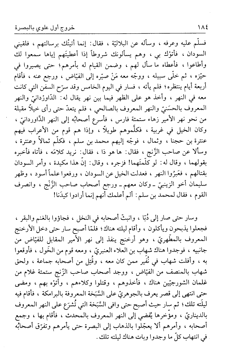 فسلّم عليه وعرفه، وسأله عن البلاليّة، فقال: إنما أتيتُك برسالتهم، فلقيني السودان، فأتوْك بي، وهم يسألونك شروطًا إذا أعطيتَهم إياها سمعوا لك وأطاعوا، فأعطاه ما سأل لهم، وضمن القيام له بأمرهم؛ حتى يصيروا في حيّزه، ثم خلّى سبيله، ووجّه معه مَنْ صيّره إلى الفيّاض، ورجع عنه، فأقام أربعة أيام ينتظره؛ فلم يأته، فسار في اليوم الخامس وقد سرّح السفن التي كانت معه في النهر، وأخذ هو على الظهر فيما بين نهر يقال له: الدّاورْدانيّ والنهر المعروف بالحسَنيّ والنهر المعروف بالصالحي، فلم يتعدّ حتى رأى خيلًا مقبلة من نحو نهر الأمير زهاء ستمئة فارس، فأسرع أصحابُه إلى النهر الدَّاوردانيّ، وكان الخيل في غربية، فكلَّموهم طويلًا، وإذا هم قوم من الأعراب فيهم عنترة بن حجنا، وثمال، فوجّه إليهم محمد بن سلم، فكلّم ثمالًا وعنترة، وسألا عن صاحب الزَّنج، فقال: ها هو ذا، فقال: نريد كلامَه، فأتاه فأخبره بقولهما، وقال له: لو كلّمتَهما! فزجره، وقال: إنّ هذا مكيدة، وأمر السودان بقتالهم، فعَبرُوا النهر، فعدلت الخيل عن السودان، ورفعوا علمًا أسود، وظهر سليمان أخو الزينبيّ - وكان معهم - ورجع أصحاب صاحب الزَّنْج، وانصرف القوم، فقال لمحمد بن سلم: ألم أعلمك أنهم إنما أرادوا كيدَنا!
