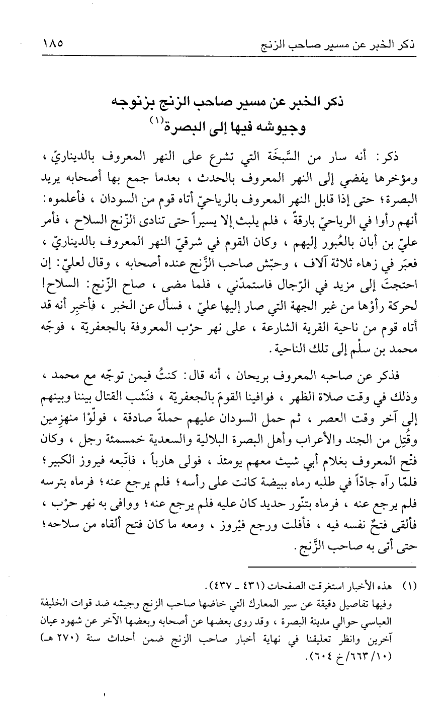 وفيها تفاصيل دقيقة عن سير المعارك التي خاضها صاحب الزنج وجيشه ضد قوات الخليفة العباسي حوالي مدينة البصرة، وقد روى بعضها عن أصحابه وبعضها الآخر عن شهود عبان آخرين وانظر تعليقنا في نهاية أخبار صاحب الزنج ضمن أحداث سنة (٢٧٠ هـ) (١٠/ ٦٦٣/ خ ٦٠٤).