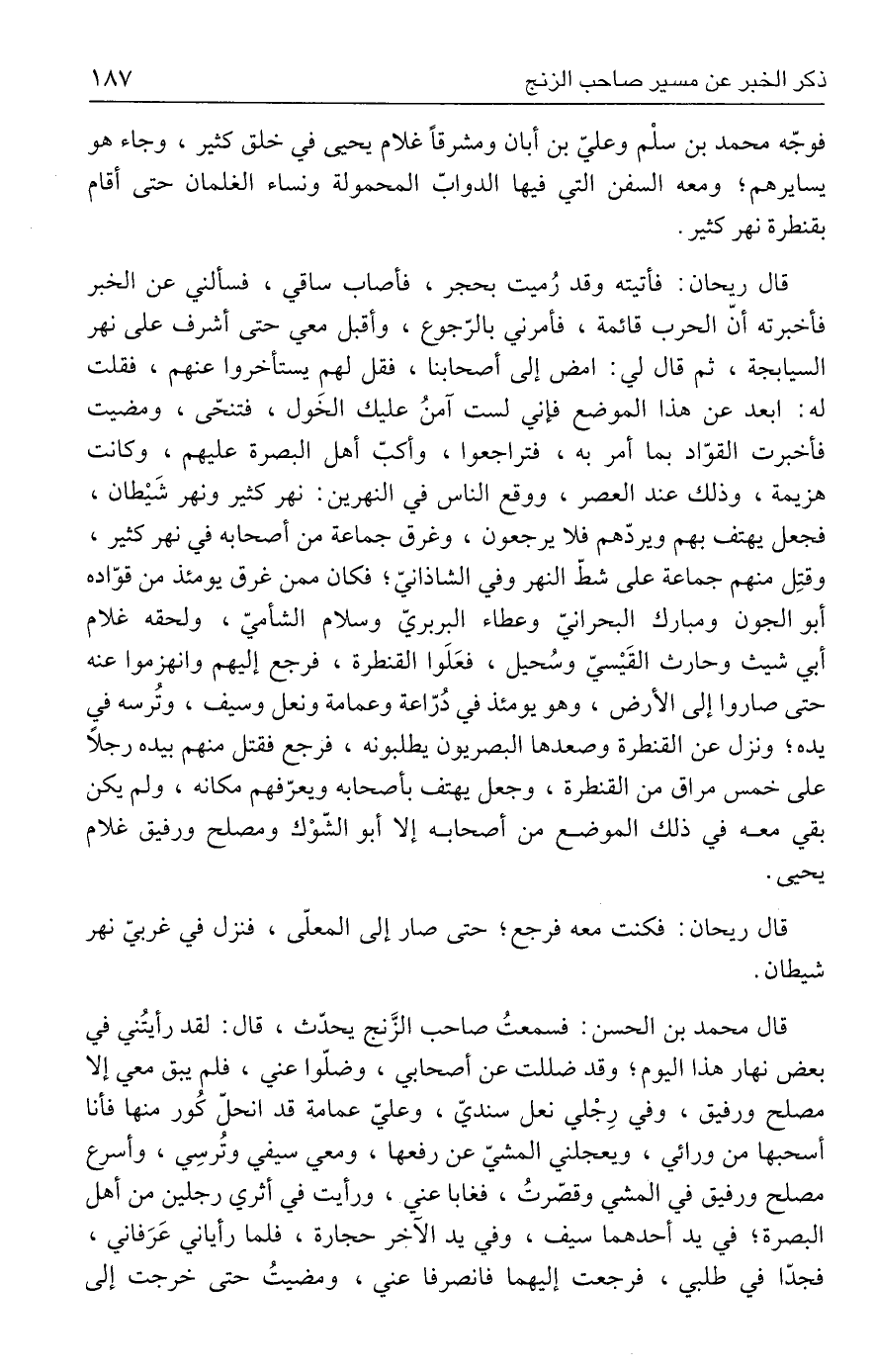 قال محمد بن الحسن: فسمعتُ صاحب الزَّنج يحدّث، قال: لقد رأيتُني في بعض نهار هذا اليوم؛ وقد ضللت عن أصحابي، وضلّوا عني، فلم يبق معي إلا مصلح ورفيق، وفي رِجْلي نعل سنديّ، وعليّ عمامة قد انحلّ كُور منها فأنا أسحبها من ورائي، ويعجلني المشيّ عن رفعها، ومعي سيفي وتُرسِي، وأسرع مصلح ورفيق في المشي وقصّرتُ، فغابا عني، ورأيت في أثري رجلين من أهل البصرة؛ في يد أحدهما سيف، وفي يد الآخر حجارة، فلما رأياني عَرَفاني، فجدّا في طلبي، فرجعت إليهما فانصرفا عني، ومضيتُ حتى خرجت إلى