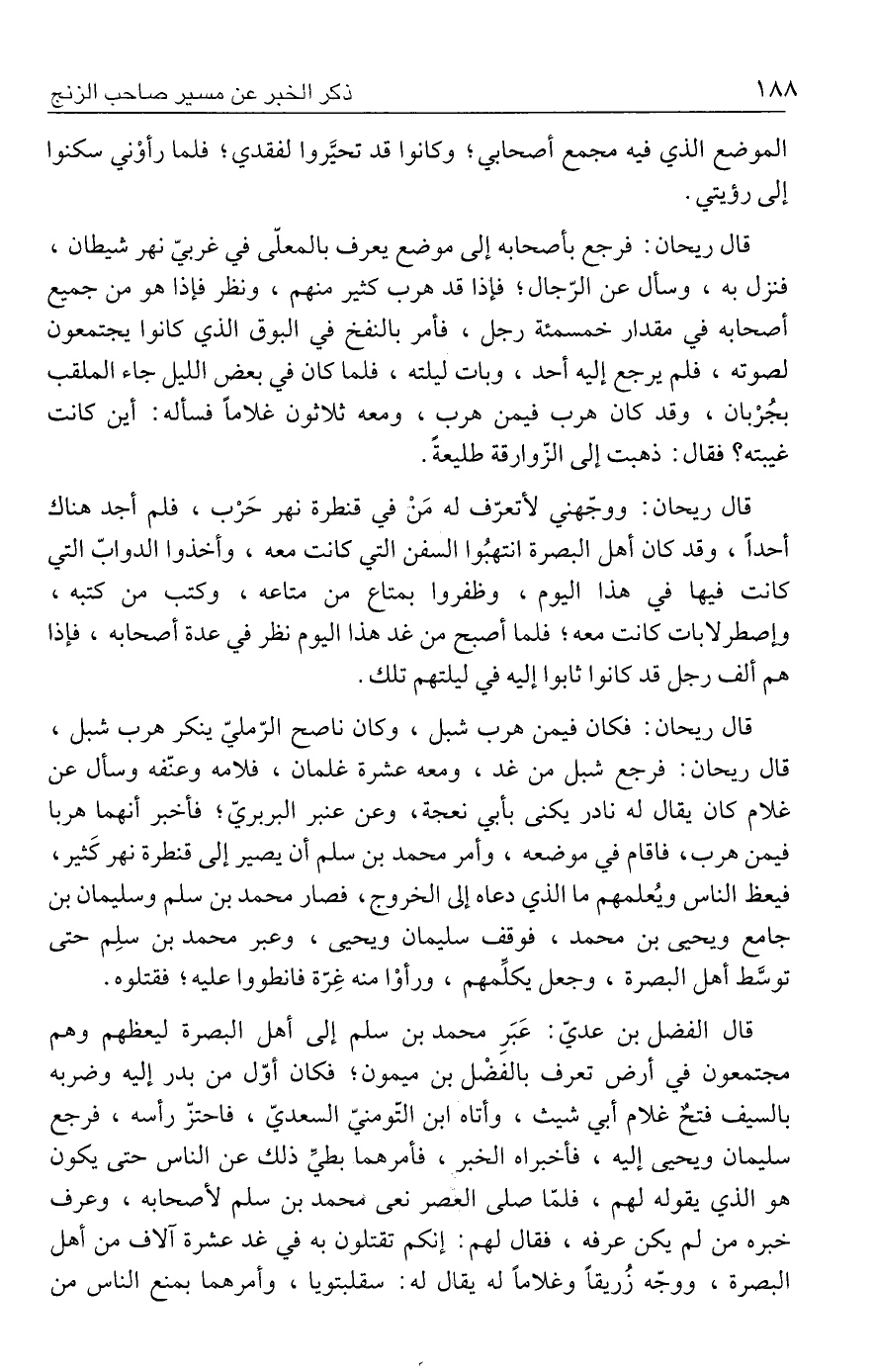 قال ريحان: ووجّهني لأتعرّف له مَنْ في قنطرة نهر حَرْب، فلم أجد هناك أحدًا، وقد كان أهل البصرة انتهبُوا السفن التي كانت معه، وأخذوا الدوابّ التي كانت فيها في هذا اليوم، وظفروا بمتاع من متاعه، وكتب من كتبه، وإصطرلابات كانت معه؛ فلما أصبح من غد هذا اليوم نظر في عدة أصحابه، فإذا هم ألف رجل قد كانوا ثابوا إليه في ليلتهم تلك.