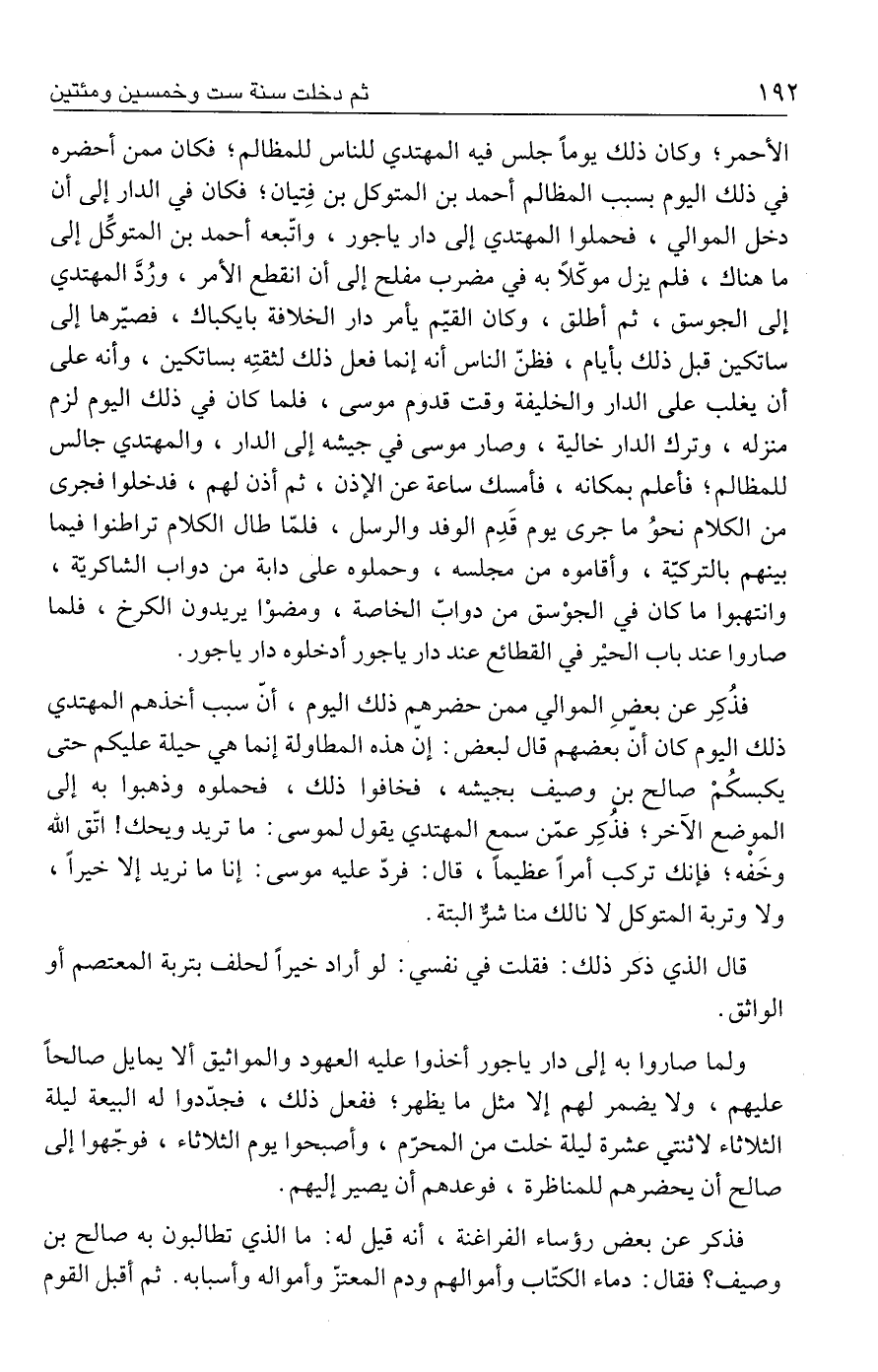 الأحمر؛ وكان ذلك يومًا جلس فيه المهتدي للناس للمظالم؛ فكان ممن أحضره في ذلك اليوم بسبب المظالم أحمد بن المتوكل بن فِتيان؛ فكان في الدار إلى أن دخل الموالي، فحملوا المهتدي إلى دار ياجور، واتّبعه أحمد بن المتوكِّل إلى ما هناك، فلم يزل موكّلًا به في مضرب مفلح إلى أن انقطع الأمر، ورُدَّ المهتدي إلى الجوسق، ثم أطلق، وكان القيّم يأمر دار الخلافة بايكباك، فصيّرها إلى ساتكين قبل ذلك بأيام، فظنّ الناس أنه إنما فعل ذلك لثقتِه بساتكين، وأنه على أن يغلب على الدار والخليفة وقت قدوم موسى، فلما كان في ذلك اليوم لزم منزله، وترك الدار خالية، وصار موسى في جيشه إلى الدار، والمهتدي جالس للمظالم؛ فأعلم بمكانه، فأمسك ساعة عن الإذن، ثم أذن لهم، فدخلوا فجرى من الكلام نحوُ ما جرى يوم قَدِم الوفد والرسل، فلمّا طال الكلام تراطنوا فيما بينهم بالتركيّة، وأقاموه من مجلسه، وحملوه على دابة من دواب الشاكريّة، وانتهبوا ما كان في الجوْسق من دوابّ الخاصة، ومضوْا يريدون الكرخ، فلما صاروا عند باب الحيْر في القطائع عند دار ياجور أدخلوه دار ياجور.