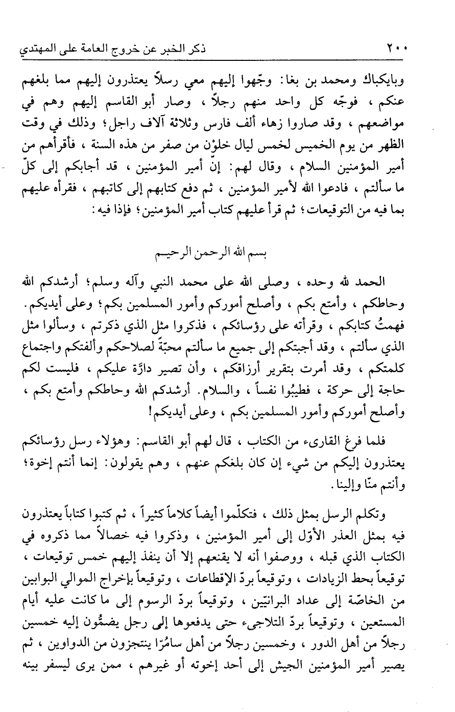 وبايكباك ومحمد بن بغا: وجّهوا إليهم معي رسلًا يعتذرون إليهم مما بلغهم عنكم، فوجّه كل واحد منهم رجلًا، وصار أبو القاسم إليهم وهم في مواضعهم، وقد صاروا زهاء ألف فارس وثلاثة آلاف راجل؛ وذلك في وقت الظهر من يوم الخميس لخمس ليال خلوْن من صفر من هذه السنة، فأقرأهم من أمير المؤمنين السلام، وقال لهم: إن أمير المؤمنين، قد أجابكم إلى كلّ ما سألتم، فادعوا الله لأمير المؤمنين، ثم دفع كتابهم إلى كاتبهم، فقرأه عليهم بما فيه من التوقيعات؛ ثم قرأ عليهم كتاب أمير المؤمنين؛ فإذا فيه: