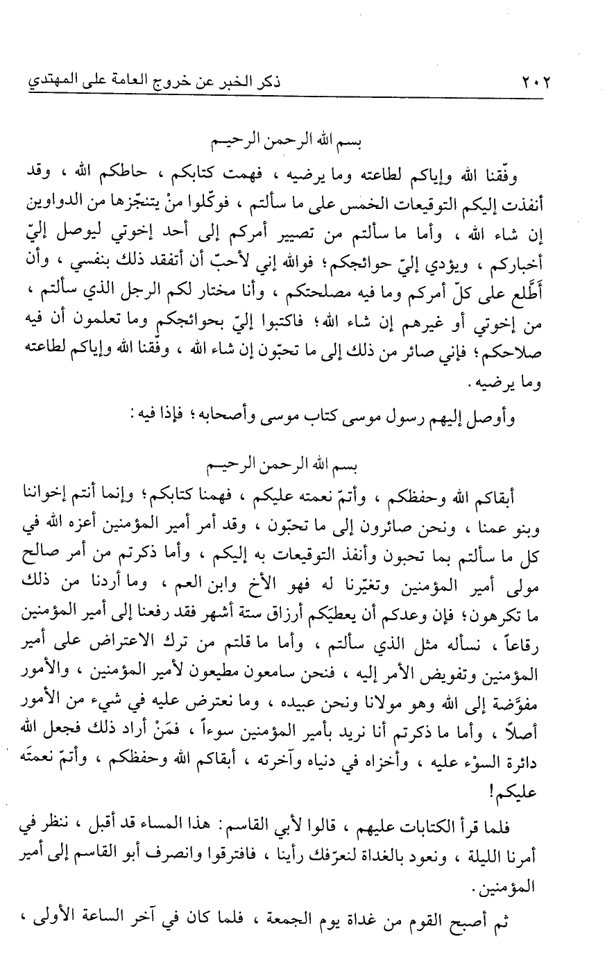 أبقاكم الله وحفظكم، وأتمّ نعمته عليكم، فهمنا كتابكم؛ وإنما أنتم إخواننا وبنو عمنا، ونحن صائرون إلى ما تحبّون، وقد أمر أمير المؤمنين أعزه الله في كل ما سألتم بما تحبون وأنفذ التوقيعات به إليكم، وأما ذكرتم من أمر صالح مولى أمير المؤمنين وتغيّرنا له فهو الأخ وابن العم، وما أردنا من ذلك ما تكرهون؛ فإن وعدكم أن يعطيَكم أرزاق ستة أشهر فقد رفعنا إلى أمير المؤمنين رقاعًا، نسأله مثل الذي سألتم، وأما ما قلتم من ترك الاعتراض على أمير المؤمنين وتفويض الأمر إليه، فنحن سامعون مطيعون لأمير المؤمنين، والأمور مفوَّضة إلى الله وهو مولانا ونحن عبيده، وما نعترض عليه في شيء من الأمور أصلًا، وأما ما ذكرتم أنا نريد بأمير المؤمنين سوءًا، فمَنْ أراد ذلك فجعل الله دائرة السوْء عليه، وأخزاه في دنياه وآخرته، أبقاكم الله وحفظكم، وأتمّ نعمتَه عليكم!