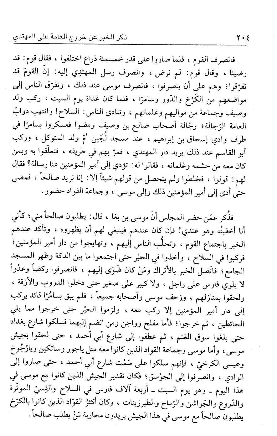 فذُكر عمّن حضر المجلس أنّ موسى بن بغا، قال: يطلبون صالحًا مني؛ كأني أنا أخفيتُه وهو عندي! فإن كان عندهم فينبغي لهم أن يظهروه، وتأكد عندهم الخبر باجتماع القوم، وتحلُّب الناس إليهم، وتهايجوا من دار أمير المؤمنين؛ فركبوا في السلاح، وأخذوا في الحيْر حتى اجتمعوا ما بين الدكة وظهر المسجد الجامع؛ فاتّصل الخبر بالأتراك ومَن كان ضَوَى إليهم، فانصرفوا ركضًا وعدْوًا لا يلوي فارس على راجل، ولا كبير على صغير حتى دخلوا الدروب والأزقة، ولحقوا بمنازلهم، وزحف موسى وأصحابه جميعًا، فلم يبق بسامُرّا قائد يركب إلى دار أمير المؤمنين إلا ركب معه، ولزموا الحيْر حتى خرجوا مما يلي الحائطين، ثم خرجوا؛ فأما مفلح وواجن ومن انضم إليهما فسلكوا شارع بغداد حتى بلغوا سوق الغنم، ثم عطفوا إلى شارع أبي أحمد، حتى لحقوا بجيش موسى، وأما موسى وجماعة القواد الذين كانوا معه مثل ياجور وساتكين ويارْجُوخ وعيسى الكرخيّ، فإنهم سلكوا على سَمْت شارع أبي أحمد، حتى صاروا إلى الوادي، وانصرفوا إلى الجوْسق؛ فكان تقدير الجيش الذين كانوا مع موسى في هذا اليوم - وهو يوم السبت - أربعة آلاف فارس في السلاح والقِسيّ الموترة والدّروع والجَواشن والرّماح والطبرزينات، وكان أكثرُ القوّاد الذين كانوا بالكرْخ يطلبون صالحًا مع موسى في هذا الجيش يريدون محاربة مَنْ يطلب صالحًا.