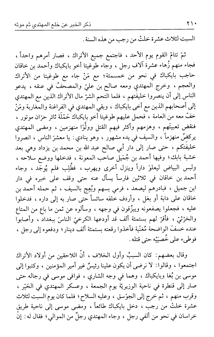 ثمّ تتامّ القوم يوم الأحد، فاجتمع جميع الأتراك، فصار أمرهم واحدًا، فجاء منهم زُهاء عشرة آلاف رجل، وجاء طوغيتا أخو بايكباك وأحمد بن خاقان حاجب بايكباك في نحو من خمسمئة؛ مع مَنْ جاء مع طوغيتا من الاْتراك والعجم، وخرج المهتدي ومعه صالح بن عليّ والمصحفُ في عنقه، يدعو الناس إلى أن ينصروا خليفتهم، فلما التحم الشرّ مال الأتراك الذين مع المهتدي إلى أصحابهم الذين مع أخي بايكباك، وبقي المهتدي في الفراغنة والمغاربة ومَنْ خفّ معه من العامة، فحمل عليهم طوغيتا أخو بايكباك حَمْلَة ثائر حرّان موتور، فنقض تعبيتَهم، وهزمهم وأكثر فيهم القتل وولَّوْا منهزمين، ومضى المهتدي يركضُ منهزمًا، والسيف في يده مشهور، وهو ينادي: يا معشرَ الناس، انصروا خليفَتكم، حتى صار إلى دار أبي صالح عبد الله بن محمد بن يزداد وهي بعد خشبة بابك؛ وفيها أحمد بن جُمَيل صاحب المعونة، فدخلها ووضع سلاحه، ولبس البياض ليعلوَ دارًا وينزل أخرى ويهرب، فطُلِب فلم يُوجَد، وجاء أحمد بن خاقان في ثلاثين فارسًا يسأل عنه حتى وقفءلى خبره في دار ابن جميل، فبادرهم ليصعد، فرمي بسهم وبُعِج بالسيف، ثم حمله أحمد بن خاقان على في ابة أو بغل، وأردف خلفه سائسًا حتى صار به إلى داره، فدخلوا عليه، فجعلوا يصفعونه ويبزُقون في وجهه، وسألوه عن ثمن ما باع من المتاع والخرْثيّ، فأقرّ لهم بستمئة ألف قد أودعها الكرخيّ الناسَ ببغداد، وأصابوا عنده خسفَ الواضحة مُغنّية فأخذوا رقعته بستمئة ألف دينار؛ ودفعوه إلى رجل، فوطئ على خُصيَيْه حتى قتله.