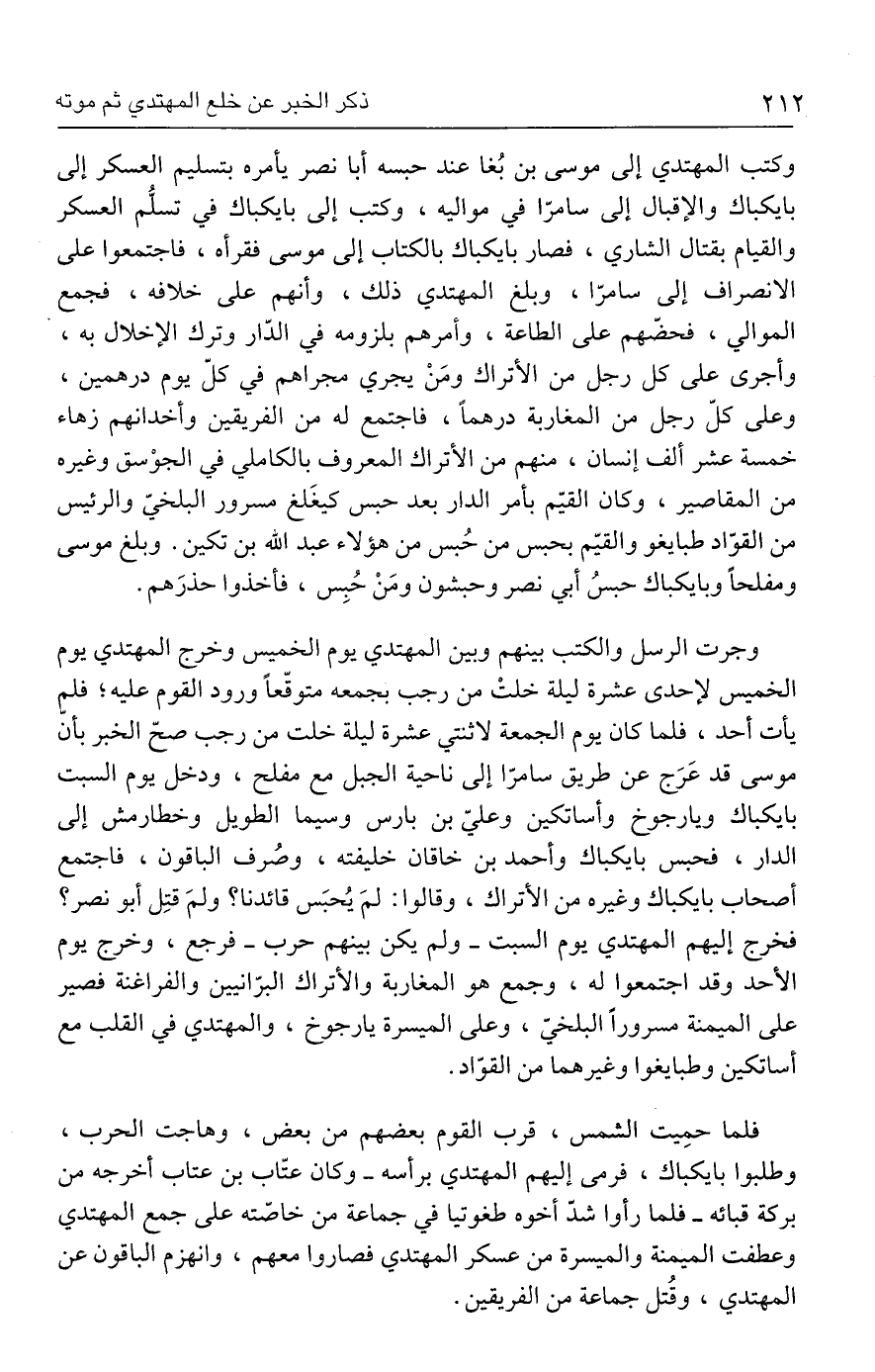 وكتب المهتدي إلى موسى بن بُغا عند حبسه أبا نصر يأمره بتسليم العسكر إلى بايكباك والإقبال إلى سامرّا في مواليه، وكتب إلى بايكباك في تسلُّم العسكر والقيام بقتال الشاري، فصار بايكباك بالكتاب إلى موسى فقرأه، فاجتمعوا على الانصراف إلى سامرّا، وبلغ المهتدي ذلك، وأنهم على خلافه، فجمع الموالي، فحضّهم على الطاعة، وأمرهم بلزومه في الدّار وترك الإخلال به، وأجرى على كل رجل من الأتراك ومَنْ يجري مجراهم في كلّ يوم درهمين، وعلى كلّ رجل من المغاربة درهمًا، فاجتمع له من الفريقين وأخدانهم زهاء خمسة عشر ألف إنسان، منهم من الأتراك المعروف بالكاملي في الجوْسق وغيره من المقاصير، وكان القيّم بأمر الدار بعد حبس كيغَلغ مسرور البلخيّ والرئيس من القوّاد طبايغو والقيّم بحبس من حُبس من هؤلاء عبد الله بن تكين. وبلغ موسى ومفلحًا وبايكباك حبسُ أبي نصر وحبشون ومَنْ حُبِس، فأخذوا حذرَهم.