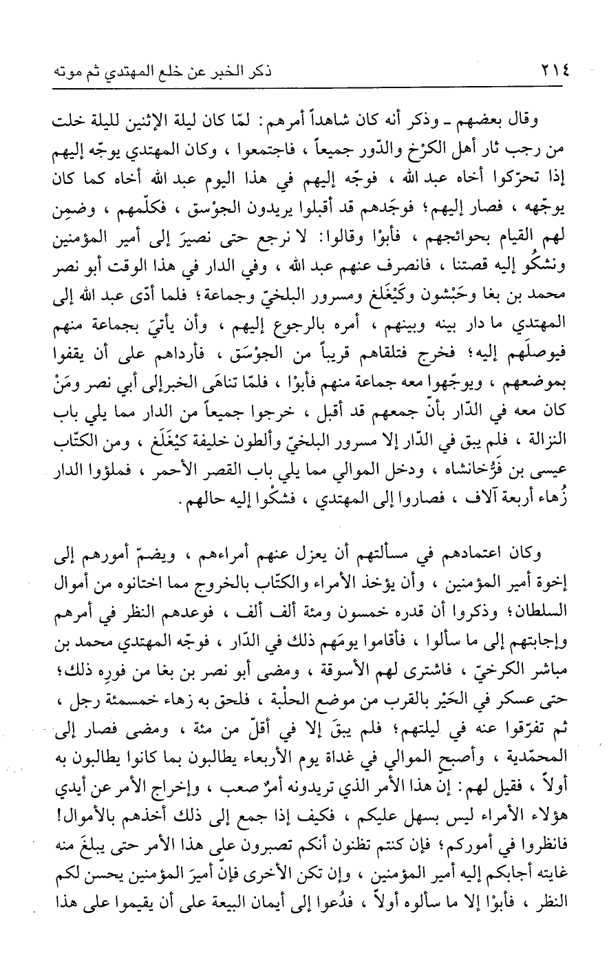 وكان اعتمادهم في مسألتهم أن يعزل عنهم أمراءهم، ويضمّ أمورهم إلى إخوة أمير المؤمنين، وأن يؤخذ الأمراء والكتّاب بالخروج مما اختانوه من أموال السلطان؛ وذكروا أن قدره خمسون ومئة ألف ألف، فوعدهم النظر في أمرهم وإجابتهم إلى ما سألوا، فأقاموا يومَهم ذلك في الدّار، فوجّه المهتدي محمد بن مباشر الكرخيّ، فاشترى لهم الأسوقة، ومضى أبو نصر بن بغا من فورِه ذلك؛ حتى عسكر في الحَيْر بالقرب من موضع الحلْبة، فلحق به زهاء خمسمئة رجل، ثم تفرّقوا عنه في ليلتهم؛ فلم يبقَ إلا في أقلّ من مئة، ومضى فصار إلى المحمّدية، وأصبح الموالي في غداة يوم الأربعاء يطالبون بما كانوا يطالبون به أولًا، فقيل لهم: إن هذا الأمر الذي تريدونه أمرٌ صعب، وإخراج الأمر عن أيدي هؤلاء الأمراء ليس بسهل عليكم، فكيف إذا جمع إلى ذلك أخذهم بالأموال! فانظروا في أموركم؛ فإن كنتم تظنون أنكم تصبرون عيى هذا الأمر حتى يبلغَ منه غايته أجابكم إليه أمير المؤمنين، وإن تكن الأخرى فإنّ أميرَ المؤمنين يحسن لكم النظر، فأبوْا إلا ما سألوه أولًا، فدُعوا إلى أيمان البيعة على أن يقيموا على هذا