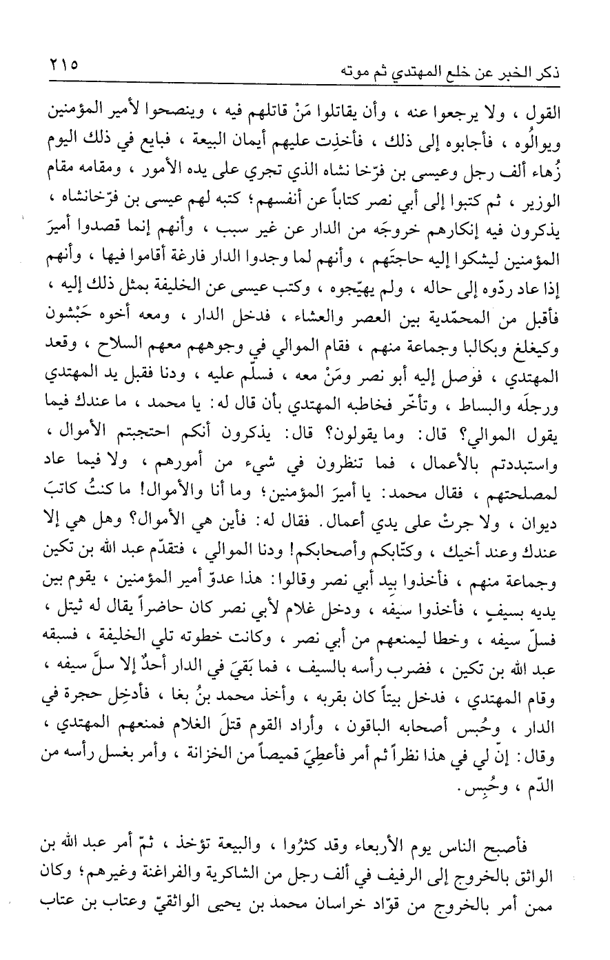 القول، ولا يرجعوا عنه، وأن يقاتلوا مَنْ قاتلهم فيه، وينصحوا لأمير المؤمنين ويوالُوه، فأجابوه إلى ذلك، فأخذِت عليهم أيمان البيعة، فبايع في ذلك اليوم زُهاء ألف رجل وعيسى بن فرّخا نشاه الذي تجري على يده الأمور، ومقامه مقام الوزير، ثم كتبوا إلى أبي نصر كتابًا عن أنفسهم؛ كتبه لهم عيسى بن فرّخانشاه، يذكرون فيه إنكارهم خروجَه من الدار عن غير سبب، وأنهم إنما قصدوا أميرَ المؤمنين ليشكوا إليه حاجتَهم، وأنهم لما وجدوا الدار فارغة أقاموا فيها، وأنهم إذا عاد ردّوه إلى حاله، ولم يهيّجوه، وكتب عيسى عن الخليفة بمثل ذلك إليه، فأقبل من المحمّدية بين العصر والعشاء، فدخل الدار، ومعه أخوه حَبْشون وكيغلغ وبكالبا وجماعة منهم، فقام الموالي في وجوههم معهم السلاح، وقعد المهتدي، فوصل إليه أبو نصر ومَنْ معه، فسلّم عليه، ودنا فقبل يد المهتدي ورجلَه والبساط، وتأخّر فخاطبه المهتدي بأن قال له: يا محمد، ما عندك فيما يقول الموالي؟ قال: وما يقولون؟ قال: يذكرون أنكم احتجبتم الأموال، واستبددتم بالأعمال، فما تنظرون في شيء من أمورهم، ولا فيما عاد لمصلحتهم، فقال محمد: يا أميرَ المؤمنين؛ وما أنا والأموال! ما كنتُ كاتبَ ديوان، ولا جرتْ على يدي أعمال. فقال له: فأين هي الأموال؟ وهل هي إلا عندك وعند أخيك، وكتّابكم وأصحابكم! ودنا الموالي، فتقدّم عبد الله بن تكين وجماعة منهم، فأخذوا بيد أبي نصر وقالوا: هذا عدوّ أمير المؤمنين، يقوم بين يديه بسيفٍ، فأخذوا سيفَه، ودخل غلام لأبي نصر كان حاضرًا يقال له ثيتل، فسلّ سيفه، وخطا ليمنعهم من أبي نصر، وكانت خطوته تلي الخليفة، فسبقه عبد الله بن تكين، فضرب رأسه بالسيف، فما بَقيَ في الدار أحدٌ إلا سلَّ سيفه، وقام المهتدي، فدخل بيتًا كان بقربه، وأخذ محمد بنُ بغا، فأدخِل حجرة في الدار، وحُبس أصحابه الباقون، وأراد القوم قتلَ الغلام فمنعهم المهتدي، وقال: إنّ لي في هذا نظرًا ثم أمر فأعطِيَ قميصًا من الخزانة، وأمر بغسل رأسه من الدّم، وحُبِس.