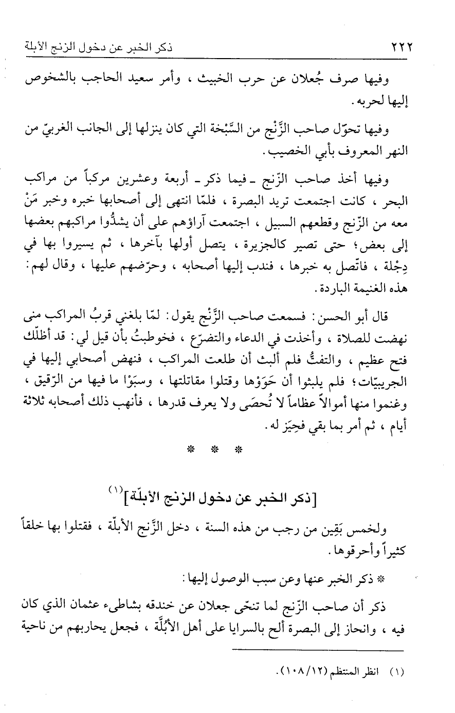 ولخمس بَقِين من رجب من هذه السنة، دخل الزَّنج الأبلّة، فقتلوا بها خلقًا كثيرًا وأحرقوها.