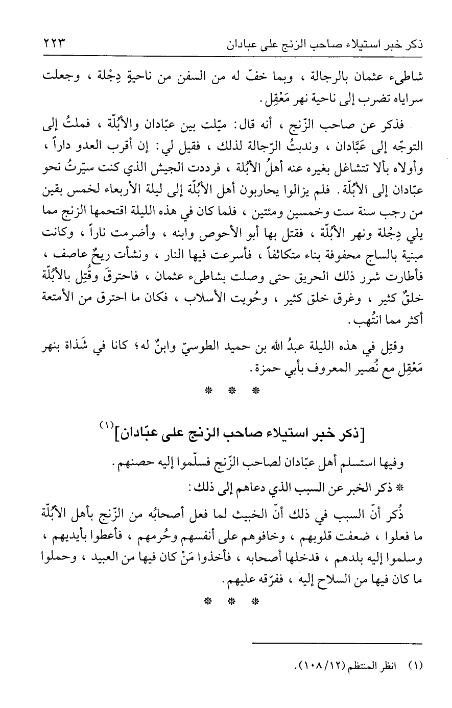 فذكر عن صاحب الزّنج، أنه قال: ميّلت بين عبّادان والأبُلّة، فملتُ إلى التوجّه إلى عَبَّادان، وندبتُ الرّجالة لذلك، فقيل لي: إن أقرب العدو دارًا، وأولاه بألا تتشاغل بغيره عنه أهلُ الأبُلة، فرددت الجيش الذي كنت سيّرتُ نحو عبّادان إلى الأبُلّة. فلم يزالوا يحاربون أهل الأبُلّة إلى ليلة الأربعاء لخمس بقين من رجب سنة ست وخمسين ومئتين، فلما كان في هذه الليلة اقتحمها الزنج مما يلي دِجْلة ونهر الأبُلّة، فقتل بها أبو الأحوص وابنه، وأضرمت نارًا، وكانت مبنية بالساج محفوفة بناء متكاثفًا، فأسرعت فيها النار، ونشأت ريحٌ عاصف، فأطارت شرر ذلك الحريق حتى وصلت بشاطئ عثمان، فاحتردتىَ وقُتِل بالأبُلّة خلقٌ كثير، وغرق خلق كثير، وحُويت الأسلاب، فكان ما احترق من الأمتعة أكثر مما انتُهب.