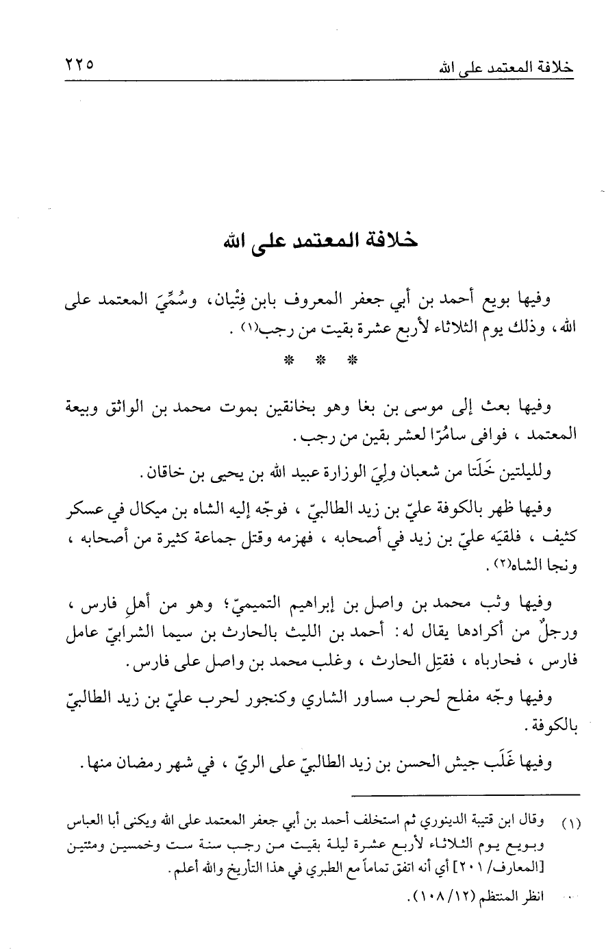 (١) وقال ابن قتيبة الدينوري ثم استخلف أحمد بن أبي جعفر المعتمد على الله ويكنى أبا العباس وبويع يوم الثلاثاء لأربع عشرة ليلة بقيت من رجب سنة ست وخمسين ومئتين [المعارف/ ٢٠١] أي أنه اتفق تمامًا مع الطبري في هذا التأريخ والله أعلم.