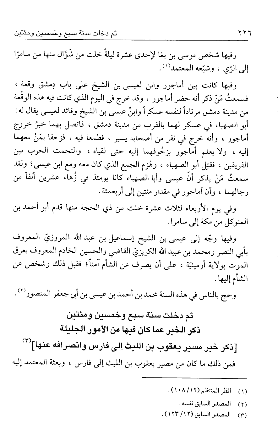 وفيها كانت بين أماجور وابن لعيسى بن الشيخ على باب دِمشق وقعة، فسمعتُ مَنْ ذكر أنه حضر أماجور، وقد خرج في اليوم الذي كانت فيه هذه الوقْعة من مدينة دمشق مرتادًا لنفسه عسكرًا وابنُ عيسى بن الشيخ وقائد لعيسى يقال له: أبو الصهباء في عسكر لهما بالقرب من مدينة دمشق، فاتصل بهما خبرُ خروج أماجور، وأنه خرج في نفر من أصحابه يسير، فطمعا فيه، فزحفا بمَنْ معهما إليه، ولا يعلم أماجور بزحُوفهما إليه حتى لقياه، والتحمت الحرب بين الفريقين، فقتِل أبو الصهباء، وهُزم الجمع الذي كان معه ومع ابن عيسى؛ ولقد سمعتُ مَنْ يذكر أنّ عيسى وأبا الصهباء كانا يومئذ في زُهاء عشرين ألفًا من رجالهما، وأن أماجور في مقدار مئتين إلى أربعمئة.