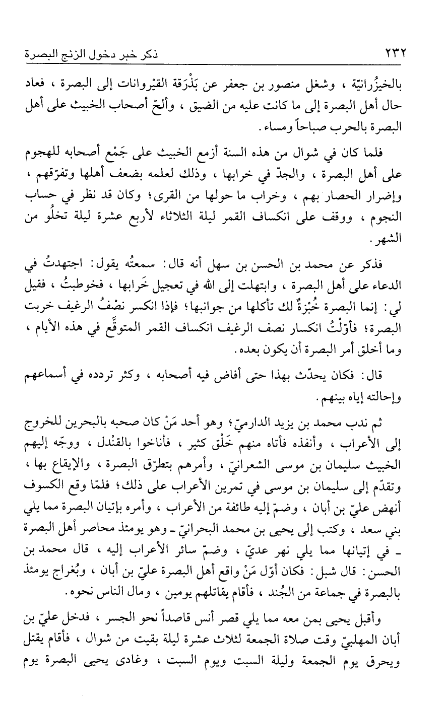 فذكر عن محمد بن الحسن بن سهل أنه قال: سمعتُه يقول: اجتهدتُ في الدعاء على أهل البصرة، وابتهلت إلى الله في تعجيل خَرابها، فخوطبتُ، فقيل لي: إنما البصرة خُبْزةٌ لك تأكلها من جوانبها؛ فإذا انكسر نصْفُ الرغيف خربت البصرة؛ فأوّلْتُ انكسار نصف الرغيف انكساف القمر المتوقَّع في هذه الأيام، وما أخلق أمر البصرة أن يكون بعده.