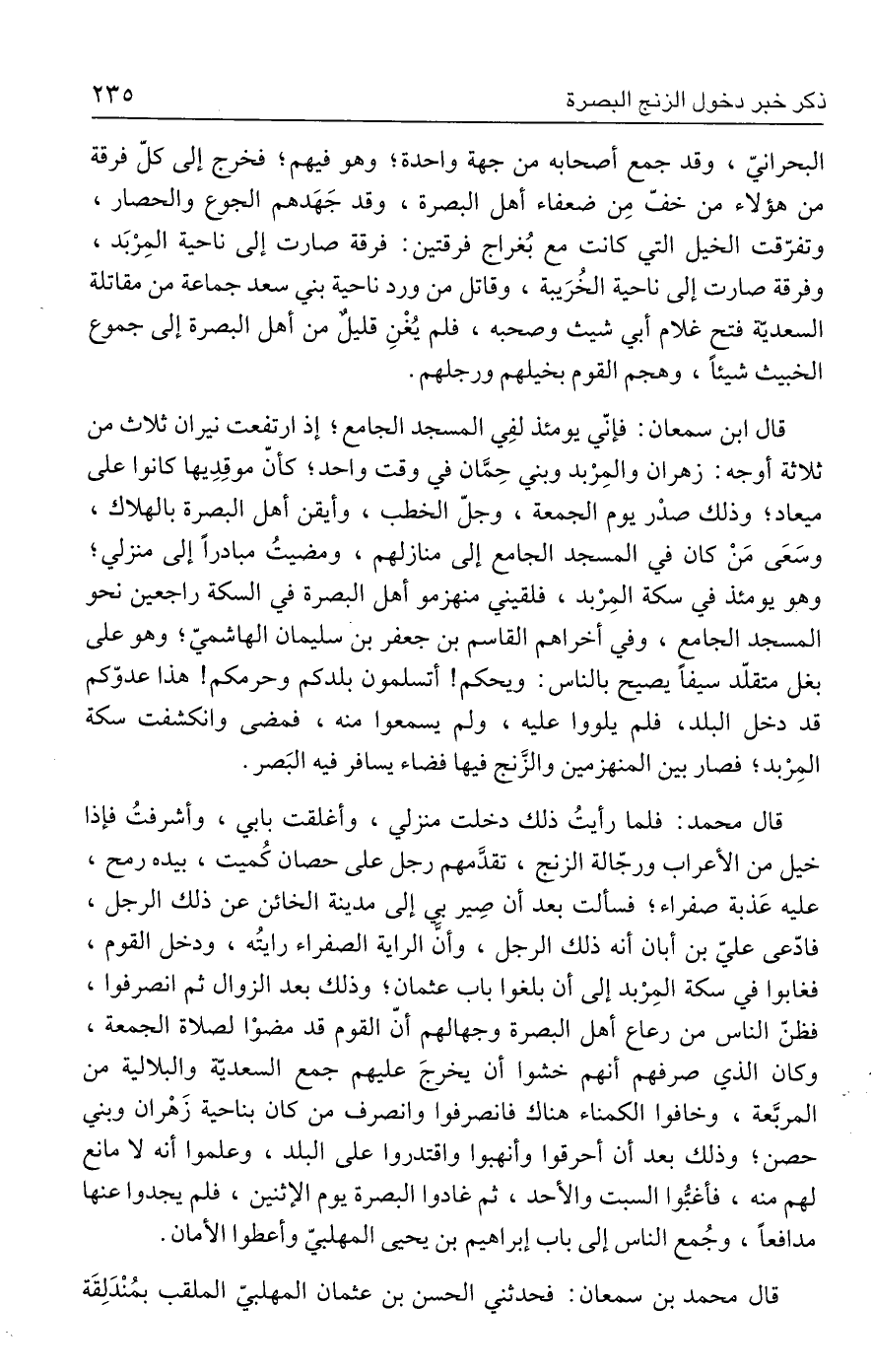 قال محمد: فلما رأيتُ ذلك دخلت منزلي، وأغلقت بابي، وأشرفتُ فإذا خيل من الأعراب ورجّالة الزنج، تقدَّمهم رجل على حصان كُميت، بيده رمح، عليه عَذبة صفراء؛ فسألت بعد أن صِير بي إلى مدينة الخائن عن ذلك الرجل، فادّعى عليّ بن أبان أنه ذلك الرجل، وأنَّ الراية الصفراء رايتُه، ودخل القوم، فغابوا في سكة المِرْبد إلى أن بلغوا باب عثمان؛ وذلك بعد الزوال ثم انصرفوا، فظنّ الناس من رعاع أهل البصرة وجهالهم أنّ القوم قد مضوْا لصلاة الجمعة، وكان الذي صرفهم أنهم خشوا أن يخرجَ عليهم جمع السعديّة والبلالية من المربَّعة، وخافوا الكمناء هناك فانصرفوا وانصرف من كان بناحية زَهْران وبني حصن؛ وذلك بعد أن أحرقوا وأنهبوا واقتدروا على البلد، وعلموا أنه لا مانع لهم منه، فأغبُّوا السبت والأحد، ثم غادوا البصرة يوم الإثنين، فلم يجدوا عنها مدافعًا، وجُمع الناس إلى باب إبراهيم بن يحيى المهلبيّ وأعطوا الأمان.