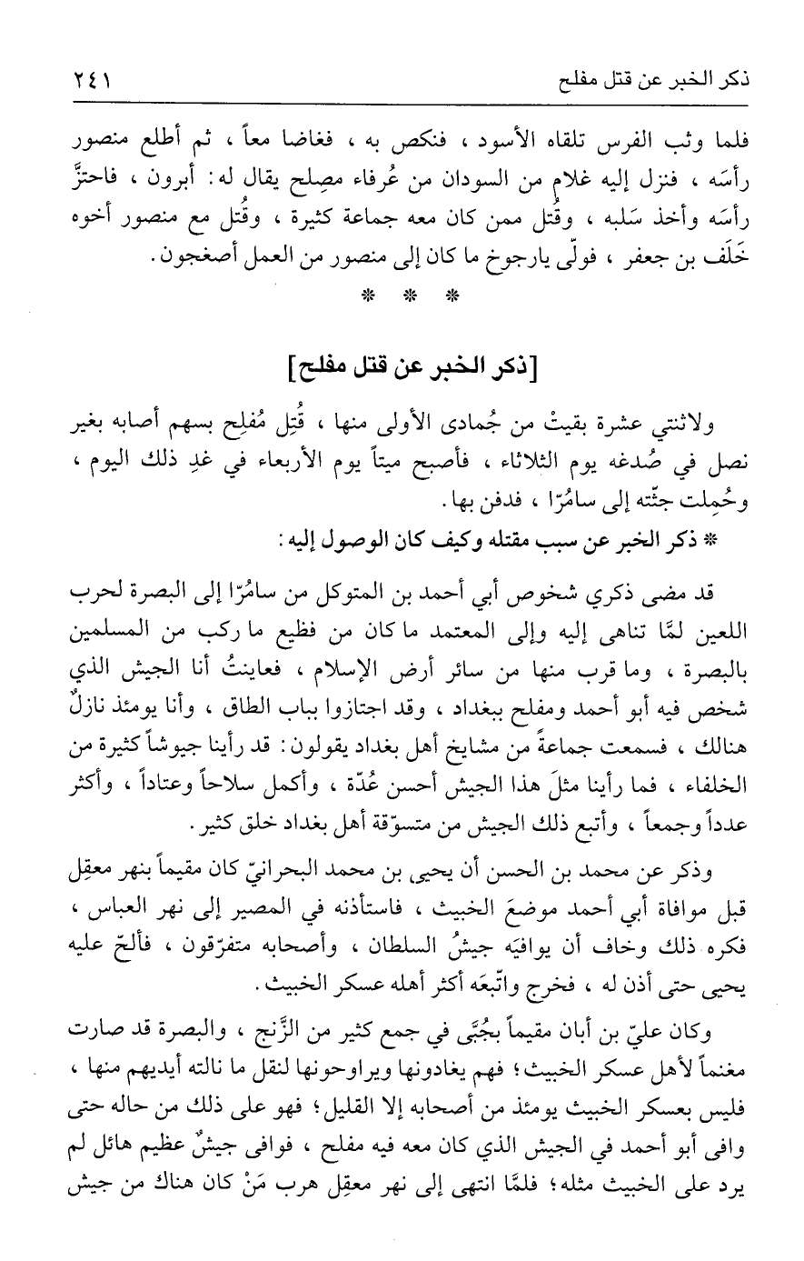 قد مضى ذكري شخوص أبي أحمد بن المتوكل من سامُرّا إلى البصرة لحرب اللعين لمَّا تناهى إليه وإلى المعتمد ما كان من فظيع ما ركب من المسلمين بالبصرة، وما قرب منها من سائر أرض الإسلام، فعاينتُ أنا الجيش الذي شخص فيه أبو أحمد ومفلح ببغداد، وقد اجتازوا بباب الطاق، وأنا يومئذ نازلٌ هنالك، فسمعت جماعةً من مشايخ أهل بغداد يقولون: قد رأينا جيوشًا كثيرة من الخلفاء، فما رأينا مثلَ هذا الجيش أحسن عُدّة، وأكمل سلاحًا وعتادًا، وأكثر عددًا وجمعًا، وأتبع ذلك الجيش من متسوّقة أهل بغداد خلق كثير.