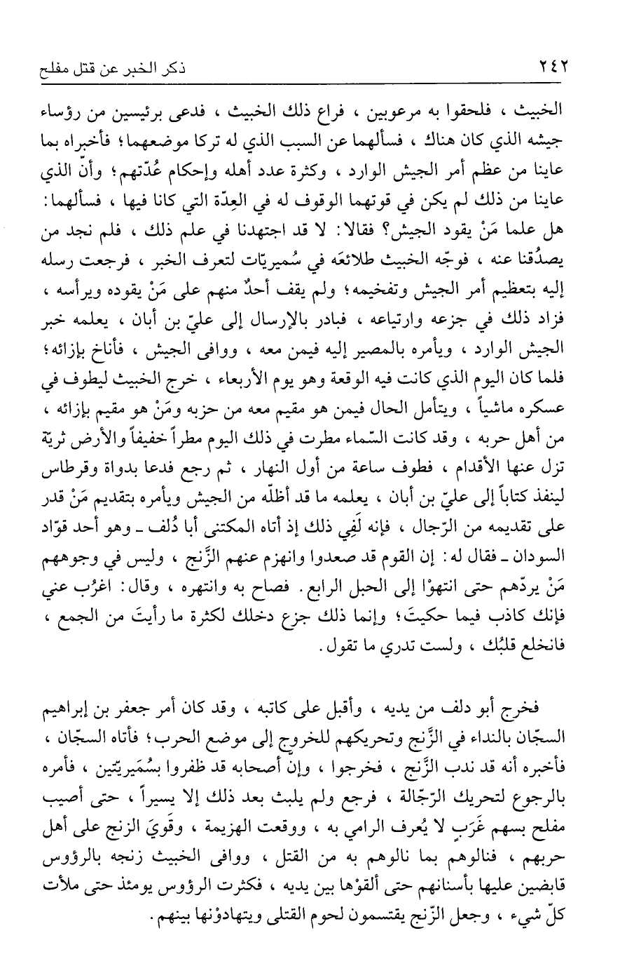 فخرج أبو دلف من يديه، وأقبل على كاتبه، وقد كان أمر جعفر بن إبراهيم السجّان بالنداء في الزَّنج وتحريكهم للخروج إلى موضع الحرب، فأتاه السجّان، فأخبره أنه قد ندب الزَّنج، فخرجوا، وإنّ أصحابه قد ظفروا بسُمَيريّتين، فأمره بالرجوع لتحريك الرّجّالة، فرجع ولم يلبث بعد ذلك إلا يسيرًا، حتى أصيب مفلح بسهم غَرَبٍ لا يُعرف الرامي به، ووقعت الهزيمة، وقَويَ الزنج على أهل حربهم، فنالوهم بما نالوهم به من القتل، ووافى الخبيث زنجه بالرؤوس قابضين عليها بأسنانهم حتى ألقوْها بين يديه، فكثرت الرؤوس يومئذ حتى ملأت كلّ شيء، وجعل الزّنج يقتسمون لحوم القتلى ويتهادوْنها بينهم.