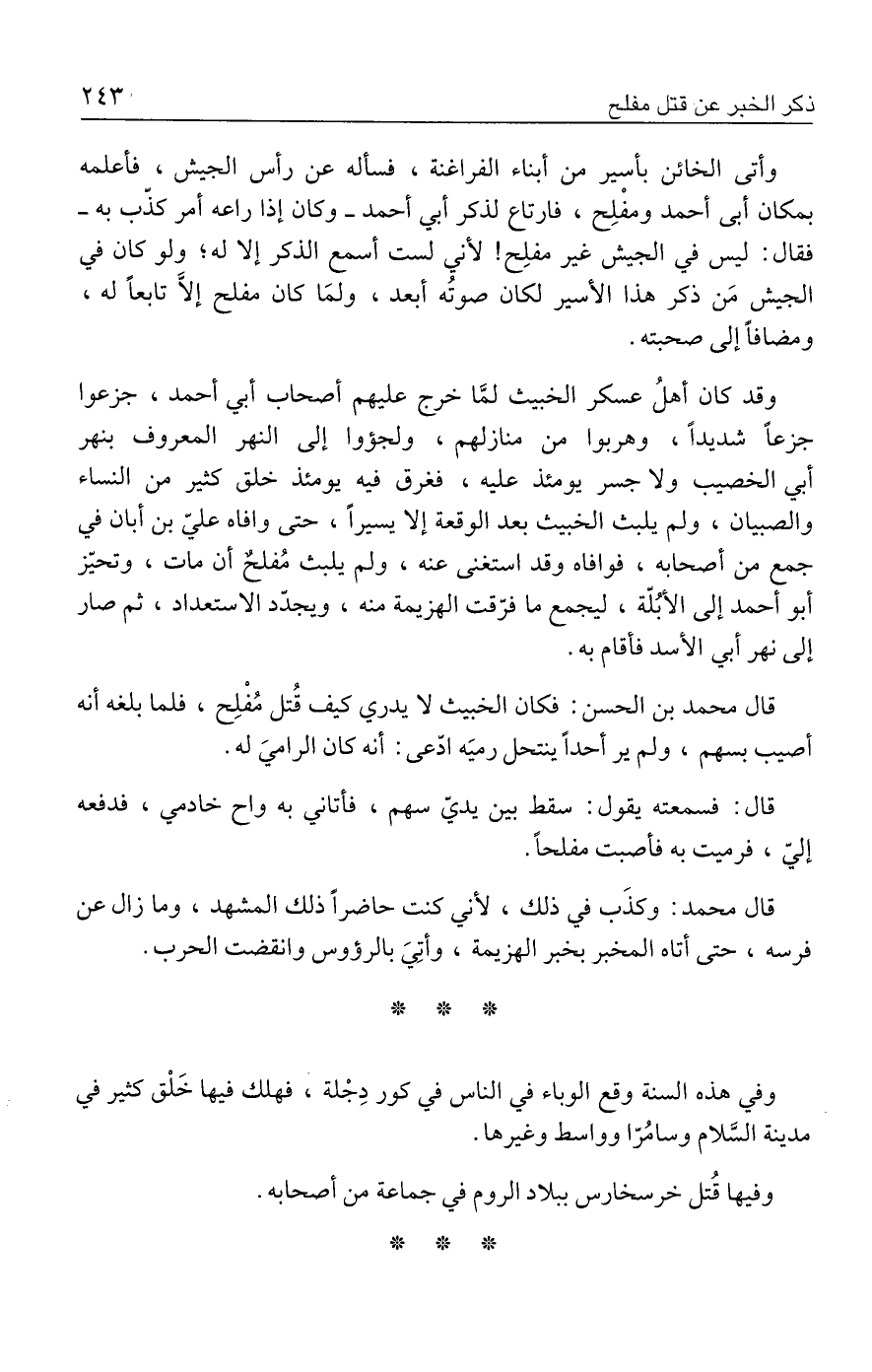 وأتى الخائن بأسير من أبناء الفراغنة، فسأله عن رأس الجيش، فأعلمه بمكان أبي أحمد ومفْلِح، فارتاع لذكر أبي أحمد - وكان إذا راعه أمر كذّب به - فقال: ليس في الجيش غير مفلِح! لأني لست أسمع الذكر إلا له؛ ولو كان في الجيش مَن ذكر هذا الأسير لكان صوتُه أبعد، ولمَا كان مفلح إلَّا تابعًا له، ومضافًا إلى صحبته.