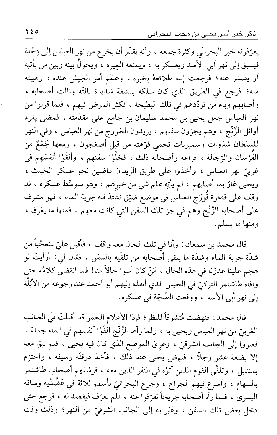 قال محمد: فنهضت مُتشوقًا للنظر؛ فإذا الأعلام الحمر قد أقبلتْ في الجانب الغربيّ من نهر العباس ويحيى به، ولما رآها الزَّنْج ألقَوْا أنفسهم في الماء جملة، فعبروا إلى الجانب الشرقيّ، وعرِيَ الموضع الذي كان فيه يحيى، فلم يبق معه إلا بضعة عشر رجلًا، فنهض يحيى عند ذلك، فأخذ درقتَه وسيفه، واحتزم بمنديل، وتلقَّى القوم الذين أتوْه في النفر الذين معه، فرشقهم أصحاب طاشتمر بالسهام، وأسرع فيهم الجراح، وجرح البحرانيّ بأسهم ثلاثة في عَضُدْيه وساقه اليسرى، فلما رآه أصحابه جريحًا تفرّقوا عنه، فلم يعرَف فيقصد له، فرجع حتى دخل بعض تلك السفن، وعَبَر به إلى الجانب الشرقيّ من النهر؛ وذلك وقت