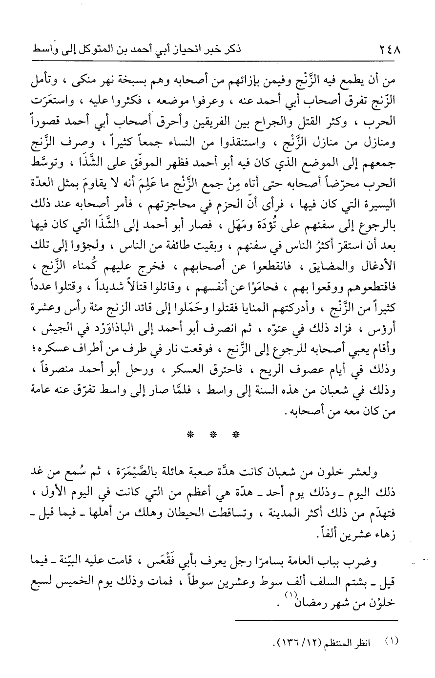 من أن يطمع فيه الزَّنْج وفيمن بإزائهم من أصحابه وهم بسبخة نهر منكى، وتأمل الزّنج تفرق أصحاب أبي أحمد عنه، وعرفوا موضعه، فكثروا عليه، واستعَرَت الحرب، وكثر القتل والجراح بين الفريقين وأحرق أصحاب أبي أحمد قصورًا ومنازل من منازل الزَّنْج، واستنقذوا من النساء جمعًا كثيرًا، وصرف الزَّنج جمعهم إلى الموضع الذي كان فيه أبو أحمد فظهر الموفّق على الشَّذَا، وتوسَّط الحرب محرّضًا أصحابه حتى أتاه مِنْ جمع الزَّنْج ما عَلِمَ أنه لا يقاومَ بمثل العدّة اليسيرة التي كان فيها، فرأى أنّ الحزم في محاجزتهم، فأمر أصحابه عند ذلك بالرجوع إلى سفنهم على تُؤدَة ومَهَل، فصار أبو أحمد إلى الشَّذَا التي كان فيها بعد أن استقرّ أكثرُ الناس في سفنهم، وبقيت طائفة من الناس، ولجؤوا إلى تلك الأدغال والمضايق، فانقطعوا عن أصحابهم، فخرج عليهم كُمناء الزَّنج، فاقتطعوهم ووقعوا بهم، فحامَوْا عن أنفسهم، وقاتلوا قتالًا شديدًا، وقتلوا عددًا كثيرًا من الزَّنْج، وأدركتهم المنايا فقتلوا وحَمَلوا إلى قائد الزنج مئة رأس وعشرة أرؤس، فزاد ذلك في عتوّه، ثم انصرف أبو أحمد إلى الباذاوَرْد في الجيش، وأقام يعبي أصحابه للرجوع إلى الزَّنج، فوقعت نار في طرف من أطراف عسكره؛ وذلك في أيام عصوف الريح، فاحترق العسكر، ورحل أبو أحمد منصرفًا، وذلك في شعبان من هذه السنة إلى واسط، فلمَّا صار إلى واسط تفرّق عنه عامة من كان معه من أصحابه.