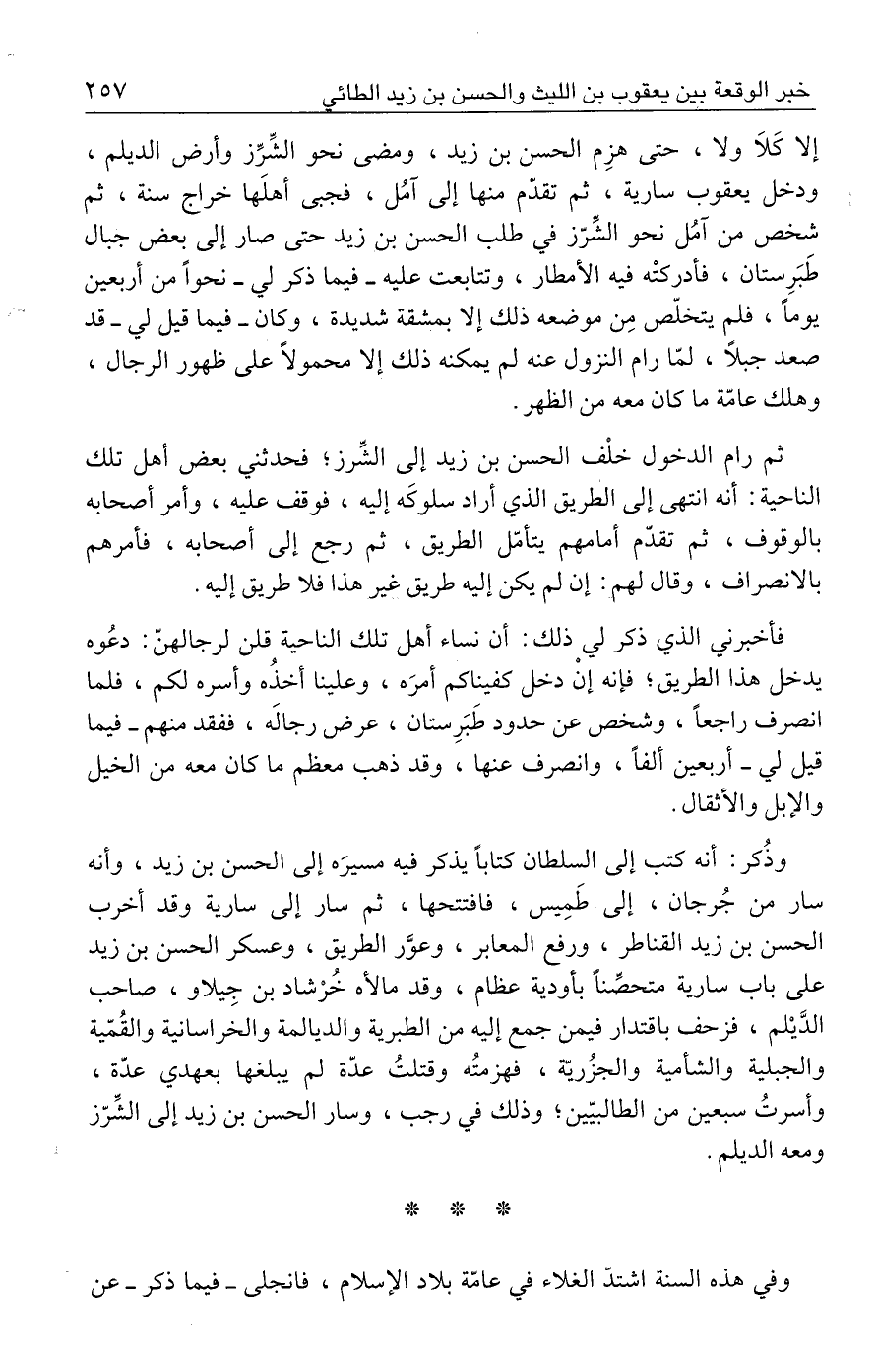 إلا كَلَا ولا، حتى هزِم الحسن بن زيد، ومضى نحو الشِّرِّز وأرض الديلم، ودخل يعقوب سارية، ثم تقدّم منها إلى آمُل، فجبى أهلَها خراج سنة، ثم شخص من آمُل نحو الشِّرّز في طلب الحسن بن زيد حتى صار إلى بعض جبال طَبَرِستان، فأدركتْه فيه الأمطار، وتتابعت عليه - فيما ذكر لي - نحوًا من أربعين يومًا، فلم يتخلّص مِن موضعه ذلك إلا بمشقة شديدة، وكان - فيما قيل لي - قد صعد جبلًا، لمّا رام النزول عنه لم يمكنه ذلك إلا محمولًا على ظهور الرجال، وهلك عامّة ما كان معه من الظهر.