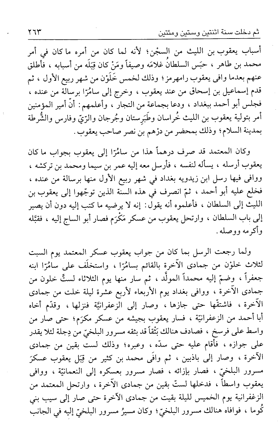 ولما رجعت الرسل بما كان من جواب يعقوب عسكر المعتمد يوم السبت لثلاث خلوْن من جمادى الآخرة بالقائم بسامُرّا، واستخلَف على سامُرّا ابنه جعفرًا، وضمّ إليه محمدًا المولَّد، ثم سار منها يوم الثلاثاء لستّ خلون من جمادى الآخرة، ووافى بغداد يوم الأربعاء لأربع عشرة ليلة خلت من جمادى الآخرة، فاشتقّها حتى جازها، وصار إلى الزعفرانيَّة فنزلها، وقدّم أخاه أبا أحمد من الزعفرانتة، فسار يعقوب بجيشه من عسكر مكرَم؛ حتى صار من واسط على فرسخ، فصادف هنالك بَثْقًا قد بثقه مسرور البلخيّ من دِجلة لئلا يقدر على جوازه، فأقام عليه حتى سدّه، وعبره؛ وذلك لست بقين من جمادى الآخرة، وصار إلى باذبين، ثم وافَى محمد بن كثير من قِبَل يعقوب عسكرَ مسرور البلخيّ، فصار بإزائه، فصار مسرور بعسكره إلى النعمانيّة، ووافى يعقوب واسطًا، فدخلها لستّ بقين من جمادى الآخرة، وارتحل المعتمد من الزغفرانية يوم الخميس لليلة بقيت من جمادى الآخرة حتى صار إلى سيب بني كُوما، فوافاه هنالك مسرور البلخيّ؛ وكان مسيرُ مسرور البلخيّ إليه في الجانب