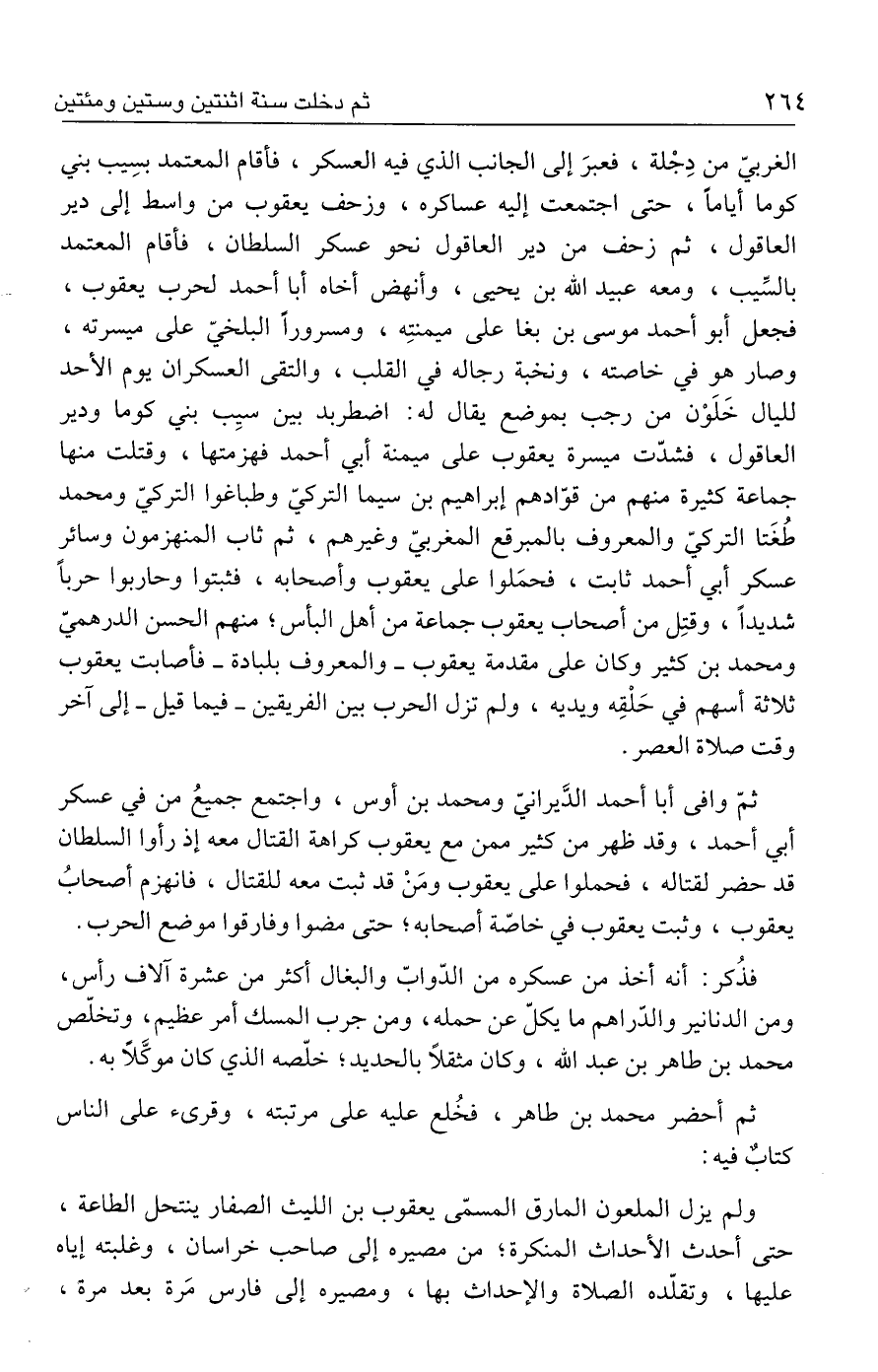 الغربيّ من دِجْلة، فعبرَ إلى الجانب الذي فيه العسكر، فأقام المعتمد بسِيب بني كوما أيامًا، حتى اجتمعت إليه عساكره، وزحف يعقوب من واسط إلى دير العاقول، ثم زحف من دير العاقول نحو عسكر السلطان، فأقام المعتمد بالسِّيب، ومعه عبيد الله بن يحيى، وأنهض أخاه أبا أحمد لحرب يعقوب، فجعل أبو أحمد موسى بن بغا على ميمنتِه، ومسرورًا البلخيّ على ميسرته، وصار هو في خاصته، ونخبة رجاله في القلب، والتقى العسكران يوم الأحد لليال خَلَوْن من رجب بموضع يقال له: اضطربد بين سيِب بني كوما وفى ير العاقول، فشدّت ميسرة يعقوب على ميمنة أبي أحمد فهزمتها، وقتلت منها جماعة كثيرة منهم من قوّادهم إبراهيم بن سيما التركيّ وطباغوا التركيّ ومحمد طُغَتا التركيّ والمعروف بالمبرقع المغربيّ وغيرهم، ثم ثاب المنهزمون وسائر عسكر أبي أحمد ثابت، فحمَلوا على يعقوب وأصحابه، فثبتوا وحاربوا حربًا شديدًا، وقتِل من أصحاب يعقوب جماعة من أهل البأس؛ منهم الحسن الدرهميّ ومحمد بن كثير وكان على مقدمة يعقوب - والمعروف بلبادة - فأصابت يعقوب ثلاثة أسهم في حَلْقِه ويديه، ولم تزل الحرب بين الفريقين - فيما قيل - إلى آخر وقت صلاة العصر.