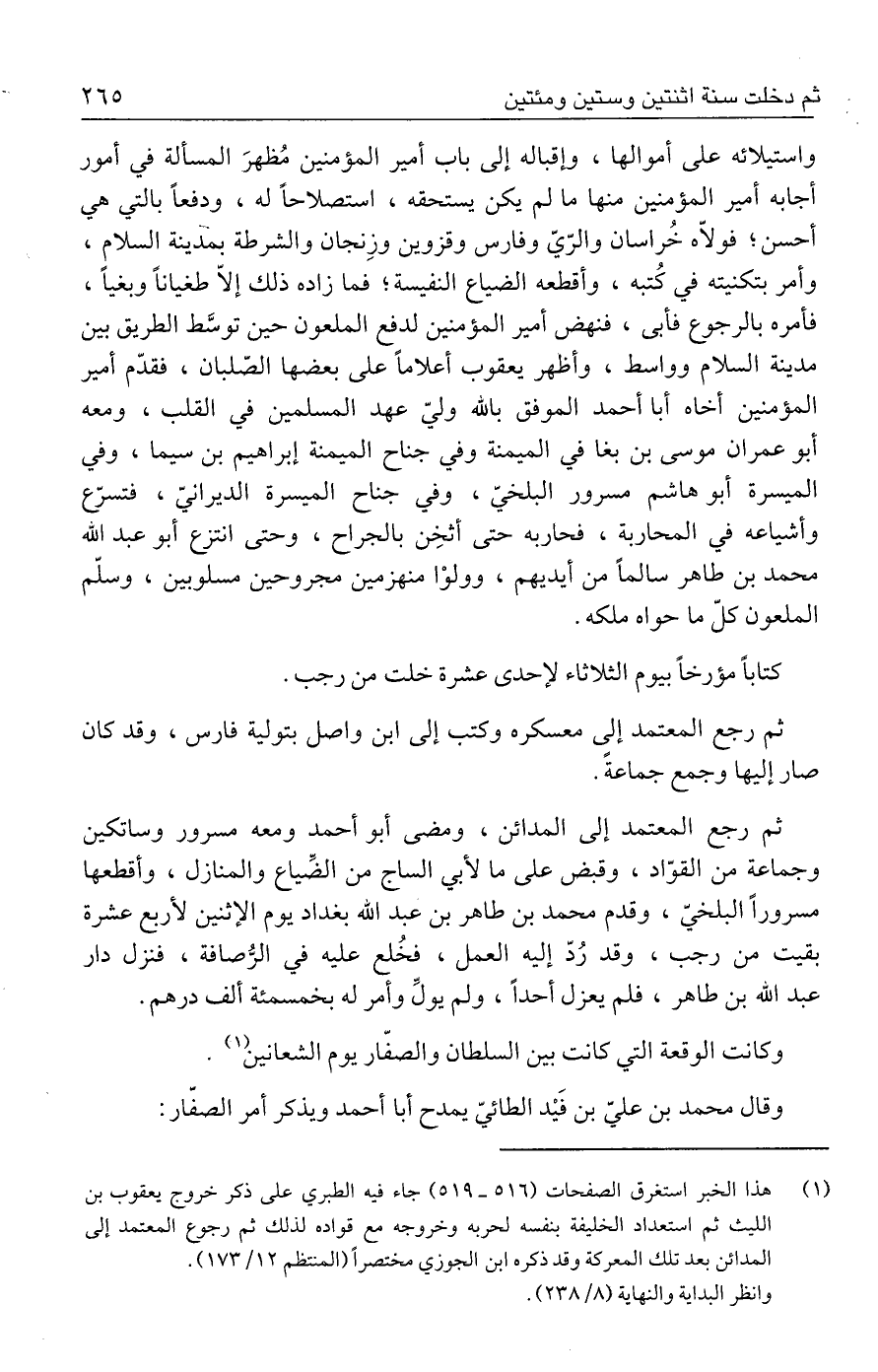 (١) هذا الخبر استغرق الصفحات (٥١٦ - ٥١٩) جاء فيه الطبري على ذكر خروج يعقوب بن الليث ثم استعداد الخليفة بنفسه لحربه وخروجه مع قواده لذلك ثم رجوع المعتمد إلى المدائن بعد تلك المعركة وقد ذكره ابن الجوزي مختصرًا (المنتظم ١٢/ ١٧٣).