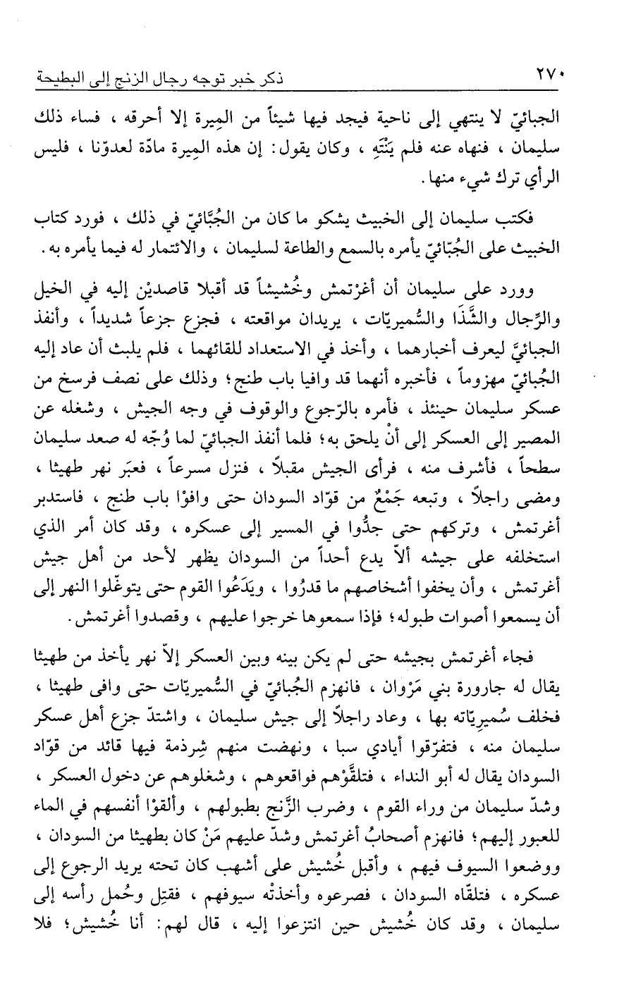 فجاء أغرتمش بجيشه حتى لم يكن بينه وبين العسكر إلّا نهر يأخذ من طهيثا يقال له جارورة بني مَرْوان، فانهزم الجُبائيّ في السُّميريّات حتى وافى طهيثا، فخلف سُميرِيّاته بها، وعاد راجلًا إلى جيش سليمان، واشتدّ جزع أهل عسكر سليمان منه، فتفرّقوا أيادي سبا، ونهضت منهم شرذمة فيها قائد من قوّاد السودان يقال له أبو النداء، فتلقَّوْهم فواقعوهم، وشغلوهم عن دخول العسكر، وشدّ سليمان من وراء القوم، وضرب الزَّنج بطبولهم، وألقوْا أنفسهم في الماء للعبور إليهم؛ فانهزم أصحابُ أغرتمش وشدّ عليهم مَنْ كان بطهيثا من السودان، ووضعوا السيوف فيهم، وأقبل خُشيش على أشهب كان تحته يريد الرجوع إلى عسكره، فتلقّاه السودان، فصرعوه وأخذتْه سيوفهم، فقتِل وحُمل رأسه إلى سليمان، وقد كان خُشيش حين انتزعوا إليه، قال لهم: أنا خُشيش؛ فلا
