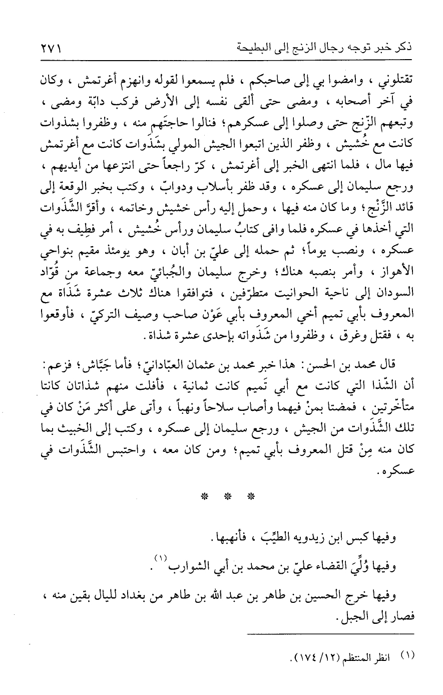 تقتلوني، وامضوا بي إلى صاحبكم، فلم يسمعوا لقوله وانهزم أغرتمش، وكان في آخر أصحابه، ومضى حتى ألقى نفسه إلى الأرض فركب دابّة ومضى، وتبعهم الزّنج حتى وصلوا إلى عسكرهم؛ فنالوا حاجتَهم منه، وظفروا بشذوات كانت مع خُشيش، وظفر الذين اتبعوا الجيش المولي بشَذوات كانت مع أغرتمش فيها مال، فلما انتهى الخبر إلى أغرتمش، كرّ راجعًا حتى انتزعها من أيديهم، ورجع سليمان إلى عسكره، وقد ظفر بأسلاب ودوابّ، وكتب بخبر الوقعة إلى قائد الزَّنْج؛ وما كان منه فيها، وحمل إليه رأس خشيش وخاتمه، وأقرَّ الشَّذَوات التي أخذها في عسكره فلما وافى كتابُ سليمان ورأس خُشيش، أمر فطِيف به في عسكره، ونصب يومًا؛ ثم حمله إلى عليّ بن أبان، وهو يومئذ مقيم بنواحي الأهواز، وأمر بنصبه هناك؛ وخرج سليمان والجُبائيّ معه وجماعة من قُوّاد السودان إلى ناحية الحوانيت متطرّفين، فتوافقوا هناك ثلاث عشرة شَذاة مع المعروف بأبي تميم أخي المعروف بأبي عَوْن صاحب وصيف التركيّ، فأوقعوا به، فقتل وغرق، وظفروا من شَذَواته بإحدى عشرة شذاة.