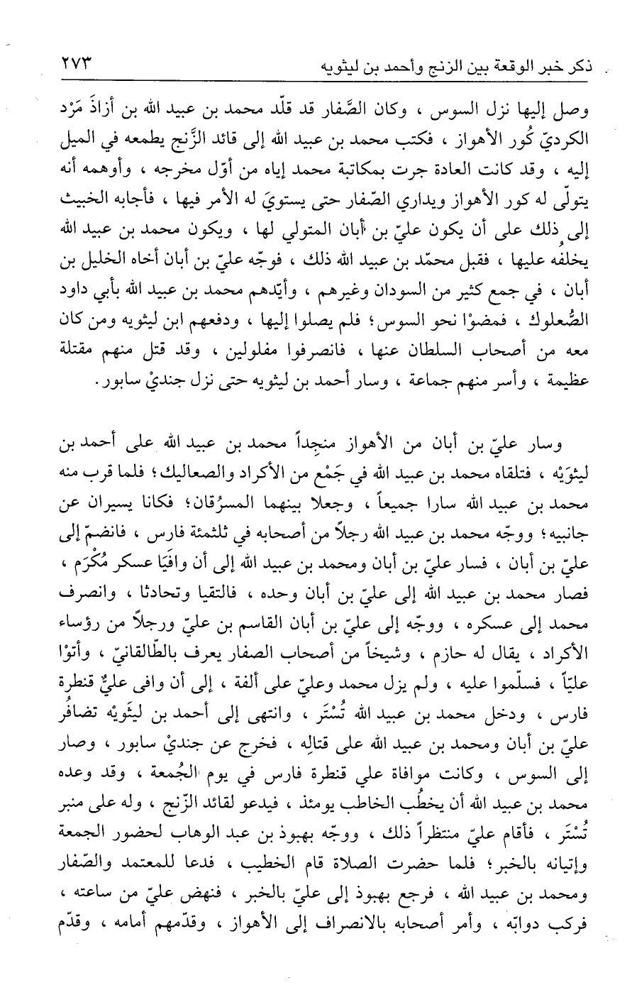 وسار عليّ بن أبان من الأهواز منجِدًا محمد بن عبيد الله على أحمد بن ليثوَيْه، فتلقاه محمد بن عبيد الله في جَمْع من الأكراد والصعاليك؛ فلما قرب منه محمد بن عبيد الله سارا جميعًا، وجعلا بينهما المسرُقان؛ فكانا يسيران عن جانبيه؛ ووجّه محمد بن عبيد الله رجلًا من أصحابه في ثلثمئة فارس، فانضمّ إلى عليّ بن أبان، فسار عليّ بن أبان ومحمد بن عبيد الله إلى أن وافَيَا عسكر مُكْرَم، فصار محمد بن عبيد الله إلى عليّ بن أبان وحده، فالتقيا وتحادثا، وانصرف محمد إلى عسكره، ووجّه إلى عليّ بن أبان القاسم بن عليّ ورجلًا من رؤساء الأكراد، يقال له حازم، وشيخًا من أصحاب الصفار يعرف بالطّالقانيّ، وأتوْا عليًّا، فسلّموا عليه، ولم يزل محمد وعلى على ألفة، إلى أن وافى عليٌّ قنطرة فارس، ودخل محمد بن عبيد الله تُسْتَر، وانتهى إلى أحمد بن ليثَويْه تضافُر عليّ بن أبان ومحمد بن عبيد الله على قتالِه، فخرج عن جنديْ سابور، وصار إلى السوس، وكانت موافاة علي قنطرة فارس في يوم الجُمعة، وقد وعده محمد بن عبيد الله أن يخطُب الخاطب يومئذ، فيدعو لقائد الزّنج، وله على منبر تُسْتَر، فأقام عليّ منتظرًا ذلك، ووجّه بهبوذ بن عبد الوهاب لحضور الجمعة وإتيانه بالخبر؛ فلما حضرت الصلاة قام الخطيب، فدعا للمعتمد والصّفار ومحمد بن عبيد الله، فرجع بهبوذ إلى عليّ بالخبر، فنهض عليّ من ساعته، فركب دوابّه، وأمر أصحابه بالانصراف إلى الأهواز، وقدّمهم أمامه، وقدّم