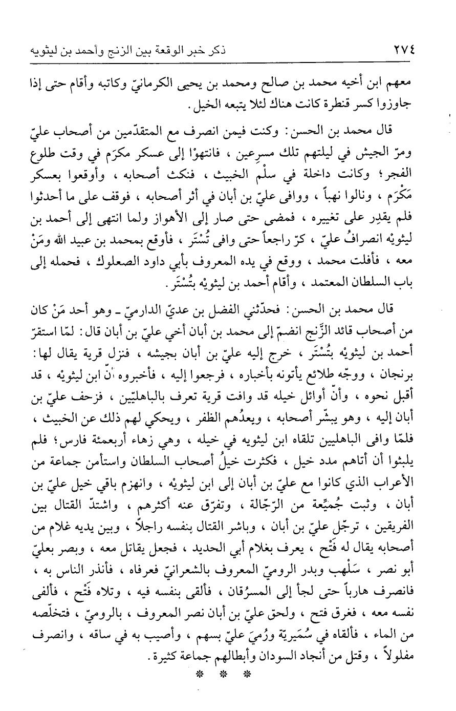 قال محمد بن الحسن: فحدّثني الفضل بن عديّ الدارميّ - وهو أحد مَنْ كان من أصحاب قائد الزّنج انضمّ إلى محمد بن أبان أخي عليّ بن أبان قال: لمّا استقرّ أحمد بن ليثويْه بتُسْتَر، خرج إليه عليّ بن أبان بجيشه، فنزل قرية يقال لها: برنجان، ووجّه طلائع يأتونه بأخباره، فرجعوا إليه، فأخبر وه أنّ ابن ليثويْه، قد أقبل نحوه، وأنّ أوائل خيله قد وافت قرية تعرف بالباهليّين، فزحف عليّ بن أبان إليه، وهو يبشّر أصحابه، ويعدُهم الظفر، ويحكي لهم ذلك عن الخبيث، فلمّا وافى الباهليين تلقاه ابن ليثويه في خيله، وهي زهاء أربعمئة فارس؛ فلم يلبثوا أن أتاهم مدد خيل، فكثرت خيلُ أصحاب السلطان واستأمن جماعة من الأعراب الذي كانوا مع عليّ بن أبان إلى ابن ليثويْه، وانهزم باقي خيل عليّ بن أبان، وثبت جُميّعة من الرّجّالة، وتفرّق عنه أكثرهم، واشتدّ القتال بين الفريقين، ترجّل عليّ بن أبان، وباشر القتال بنفسه راجلًا، وبين يديه غلام من أصحابه يقال له فتْح، يعرف بغلام أبي الحديد، فجعل يقاتل معه، وبصر بعليّ أبو نصر، سَلْهب وبدر الروميّ المعروف بالشعرانيّ فعرفاه، فأنذر الناس به، فانصرف هاربًا حتى لجأ إلى المسرُقان، فألقى بنفسه فيه، وتلاه فَتْح، فألفى نفسه معه، فغرق فتح، ولحق عليّ بن أبان نصر المعروف، بالروميّ، فتخلّصه من الماء، فألقاه في سُمَيريّة ورُميَ عليّ بسهم، وأصيب به في ساقه، وانصرف مفلولًا، وقتل من أنجاد السودان وأبطالهم جماعة كثيرة.
