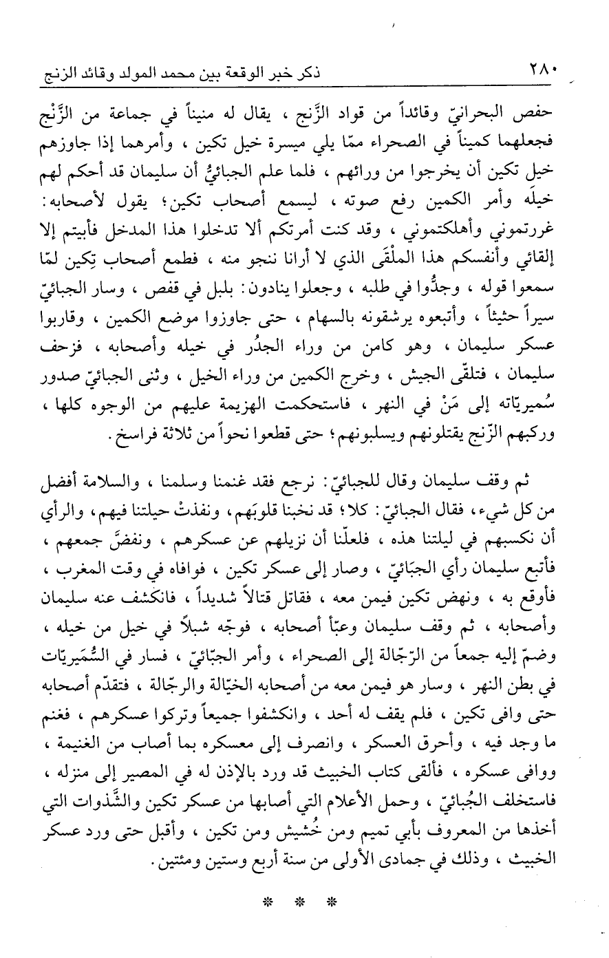 حفص البحرانيّ وقائدًا من قواد الزَّنج، يقال له منينًا في جماعة من الزَّنْج فجعلهما كمينًا في الصحراء ممّا يلي ميسرة خيل تكين، وأمرهما إذا جاوزهم خيل تكين أن يخرجوا من ورائهم، فلما علم الجبائيُّ أن سليمان قد أحكم لهم خيلَه وأمر الكمين رفع صوته، ليسمع أصحاب تكين؛ يقول لأصحابه: غررتموني وأهلكتموني، وقد كنت أمرتكم ألا تدخلوا هذا المدخل فأبيتم إلا إلقائي وأنفسكم هذا الملْقَى الذي لا أرانا ننجو منه، فطمع أصحاب تِكين لمّا سمعوا قوله، وجدُّوا في طلبه، وجعلوا ينادون: بلبل في قفص، وسار الجبائيّ سيرًا حثيثًا، وأتبعوه يرشقونه بالسهام، حتى جاوزوا موضع الكمين، وقاربوا عسكر سليمان، وهو كامن من وراء الجدُر في خيله وأصحابه، فزحف سليمان، فتلقّى الجيش، وخرج الكمين من وراء الخيل، وثنى الجبائيّ صدور سُميريّاته إلى مَنْ في النهر، فاستحكمت الهزيمة عليهم من الوجوه كلها، وركبهم الزّنج يقتلونهم ويسلبونهم؛ حتى قطعوا نحوًا من ثلاثة فراسخ.