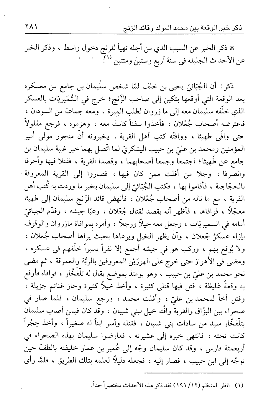 ذكر: أن الجُبّائيّ يحيى بن خلف لمّا شخص سليمان بن جامع من معسكره بعد الوقعة التي أوقعها بتكين إلى صاحب الزَّنج؛ خرج في السُّمَيريّات بالعسكر الذي خلّفه سليمان معه إلى ما زروان لطلب المِيرة، ومعه جماعة من السودان، فاعترضه أصحاب جُعْلان، فأخذوا سفنًا كانتْ معه، وهزموه، فرجع مفلولًا حتى وافَى طهيثا، ووافتْه كتب أهل القرية، يخبرونه أنّ منجور مولى أمير المؤمنين ومحمد بن عليّ بن حبيب اليشكريّ لما اتّصل بهما خبر غيبة سليمان بن جامع عن طَهيثا؛ اجتمعا وجمعا أصحابهما، وقصدا القرية، فقتلا فيها وأحرقا وانصرفا، وجلا من أفلت ممن كان فيها، فصاروا إلى القرية المعروفة بالحجّاجية، فأقاموا بها، فكتب الجُبّائيّ إلى سليمان بخبر ما وردت به كُتب أهل القرية، مع ما ناله من أصحاب جُعْلان، فأنهض قائد الزّنج سليمان إلى طهيثا معجّلًا، فوافاها، فأظهر أنه يقصد لقتال جُعْلان، وعبّأ جيشه، وقدّم الجبائيّ أمامه في السميريّات، وجعل معه خيلًا ورجلًا، وأمره بموافاة مازروان والوقوف بإزاء عسكرُ جْعلان، وأنْ يظهر الخيل ويرعاها بحيث يراها أصحاب جُعلان، ولا يُوقع بهم، وركب هو في جيشه أجمع إلا نفرا يسيرًا خلّفهم في عسكره، ومضى في الأهواز حتى خرج على الهورَيْن المعروفين بالربَّة والعمرقة، ثم مضى نحو محمد بن عليّ بن حبيب، وهو يومئذ بموضع يقال له تلّفخَّار، فوافاه فأوقع به وقعةً غليظة، قتل فيها قتلى كثيرة، وأخذ خيلًا كثيرة وحاز غنائم جزيلة، وقتل أخًا لمحمد بن عليّ، وأفلت محمد، ورجع سليمان، فلما صار في صحراء بين البزّاق والقرية وافته خيل لبني شيبان، وقد كان فيمن أصاب سليمان بتلّفخّار سيد من سادات بني شيبان، فقتله وأسر ابنًا له صغيرًا، وأخذ حِجْرًا كانت تحته، فانتهى خبره إلى عشيرته، فعارضوا سليمان بهذه الصحراء في أربعمئة فارس، وقد كان سليمان وجّه إلى عُمير بن عمار خليفته بالطفّ حين توجّه إلى ابن حبيب، فصار إليه، فجعله دليلًا لعلمه بتلك الطريق، فلمَّا رأى
