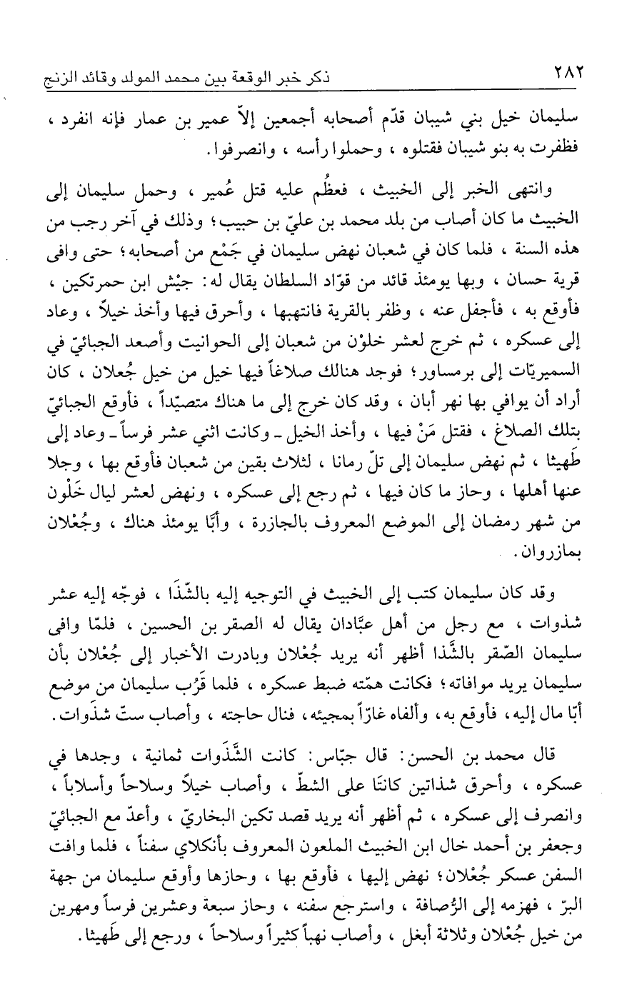 قال محمد بن الحسن: قال جبّاس: كانت الشَّذَوات ثمانية، وجدها في عسكره، وأحرق شذاتين كانتَا على الشطّ، وأصاب خيلًا وسلاحًا وأسلابًا، وانصرف إلى عسكره، ثم أظهر أنه يريد قصد تكين البخاريّ، وأعدّ مع الجبائيّ وجعفر بن أحمد خال ابن الخبيث الملعون المعروف بأنكلاي سفنًا، فلما وافت السفن عسكر جُعْلان؛ نهض إليها، فأوقع بها، وحازها وأوقع سليمان من جهة البرّ، فهزمه إلى الرُّصافة، واسترجع سفنه، وحاز سبعة وعشرين فرسًا ومهرين من خيل جُعْلان وثلاثة أبغل، وأصاب نهبًا كثيرًا وسلاحًا، ورجع إلى طَهيثا.