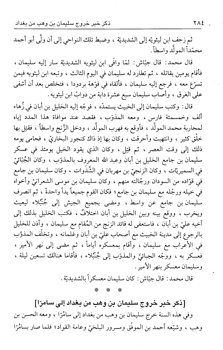 قال: وكتب سليمان إلى الخبيث يستمدّه، فوجّه إليه الخليل بن أبان في زُهاء ألف وخمسمئة فارس، ومعه المذوّب، فقصد عند موافاة هذا المدد إياه لمحاربة محمد المولَّد، فأوقع به فهرب المولَّد، ودخل الزَّنج واسطًا، فقتِل بها خلْق كثير، وانتهبت وأحرقت، وكان بها إذ ذاك كنجور البخاريّ، فحامى يومه ذلك إلى وقت العصر، ثم قتِل، وكان الذي يقود الخيل يومئذ في عسكر سليمان بن جامع الخليل بن أبان وعبد الله المعروف بالمذوّب، وكان الجُبّائيّ في السميريّات، وكان الزنجيّ بن مهربان في الشَّذَوات، وكان سليمان بن جامع في قوّاده من السودان ورجّالته منهم، وكان سليمان بن موسى الشعرانيّ وأخواه في خيله ورجْله مع سليمان بن جامع؛ فكان القوم جميعًا يدًا واحدةً، ثم انصرف سليمان بن جامع عن واسط، ومضى بجميع الجيش إلى جُنْبُلاء ليعيث ويخرب، ووقع بينه وبين الخليل بن أبان اختلافٌ، فكتب الخليل بذلك إلى أخيه عليّ بن أبان، فاستعفى له قائد الزنج من المُقام مع سليمان، وأذن للخليل بالرجوع إلى مدينة الخبيث مع أصحاب عليّ بن أبان وغلمانه، وتخلّف المذوَّب في الأعراب مع سليمان، وأقام بمعسكره أيامًا، ثم مضى إلى نهر الأمير، فعسكر به، ووجّه الجبائيَّ والمذوّب إلى جُنْبُلاء، فأقاما هنالك تسعين ليلة، وسليمان معسكر بنهر الأمير.