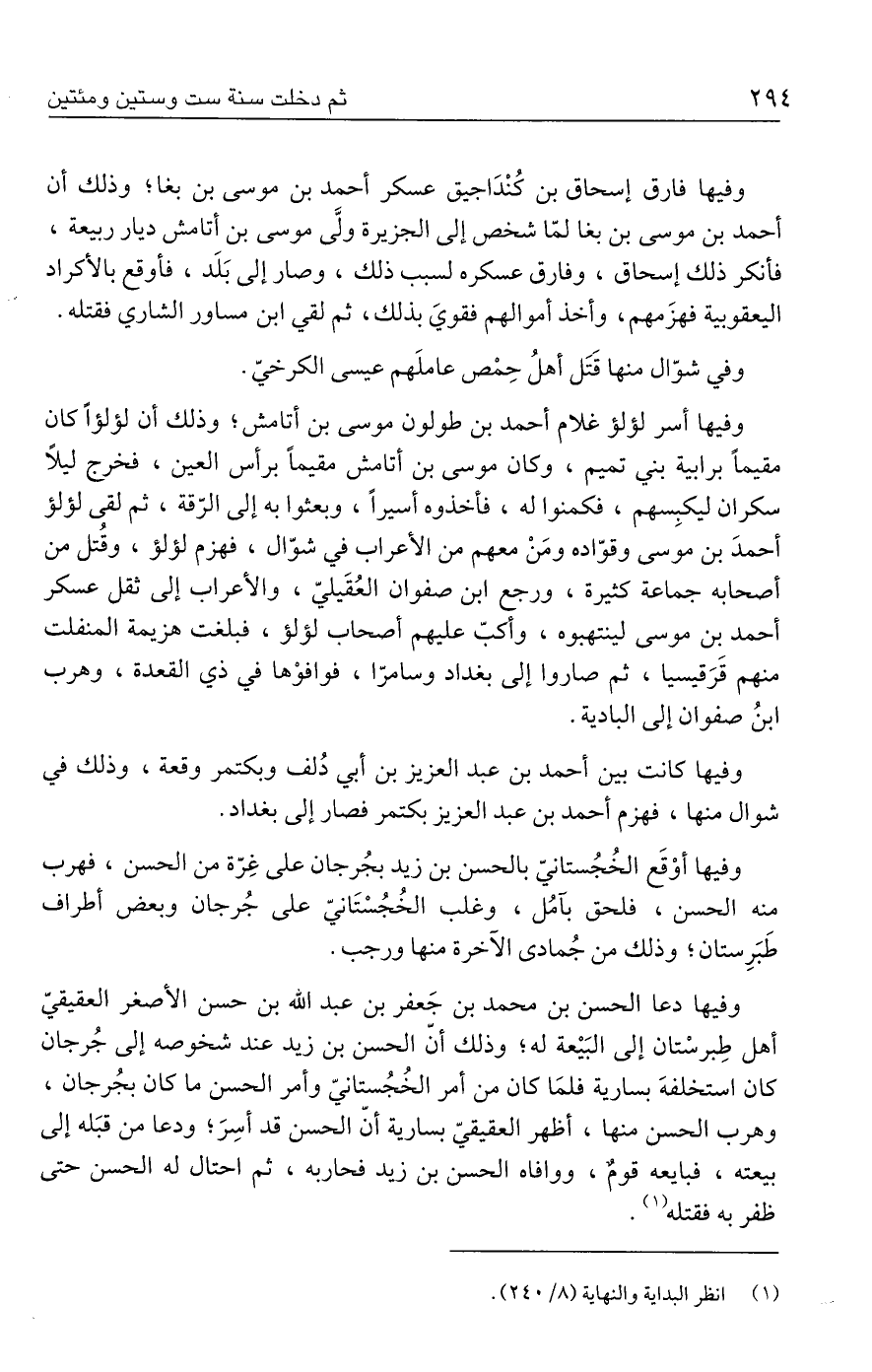 وفيها كانت بين أحمد بن عبد العزيز بن أبي دُلف وبكتمر وقعة، وذلك في شوال منها، فهزم أحمد بن عبد العزيز بكتمر فصار إلى بغداد.