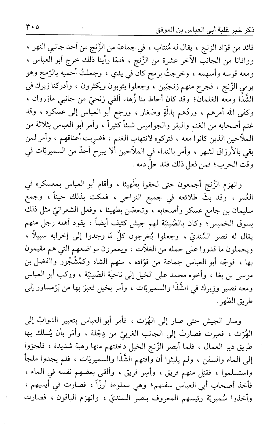 قائد من قوّاد الزنج، يقال له مُنتاب، في جماعة من الزَّنج من أحد جانبي النهر، ووافانا من الجانب الآخر عشرة من الزنج، فلمّا رأينا ذلك خرج أبو العباس، ومعه قوسه وأسهمه، وخرجتُ برمح كان في يدي، وجعلتُ أحميه بالرّمح وهو يرمي الزّنج، فجرح منهم زنجيّين، وجعلوا يثوبون ويكثرون، وأدركنا زيرك في الشَّذَا ومعه الغلمان؛ وقد كان أحاط بنا زُهاء ألفي زنحيّ من جانبي مازروان، وكفى الله أمرهم، وردّهم بذلّةٍ وصَغار، ورجع أبو العباس إلى عسكره، وقد غنم أصحابه من الغنم والبقر والجواميس شيئًا كثيرًا، وأمر أبو العباس بثلاثة من الملّاحين الذين كانوا معه، فتركوه لانتهاب الغنم، فضرِبت أعناقهم، وأمر لمن بقي بالأرزاق لشهر، وأمر بالنداء في الملّاحين ألا يبرح أحدٌ من السميريّات في وقت الحرب؛ فمن فعل ذلك فقد حلّ دمه.