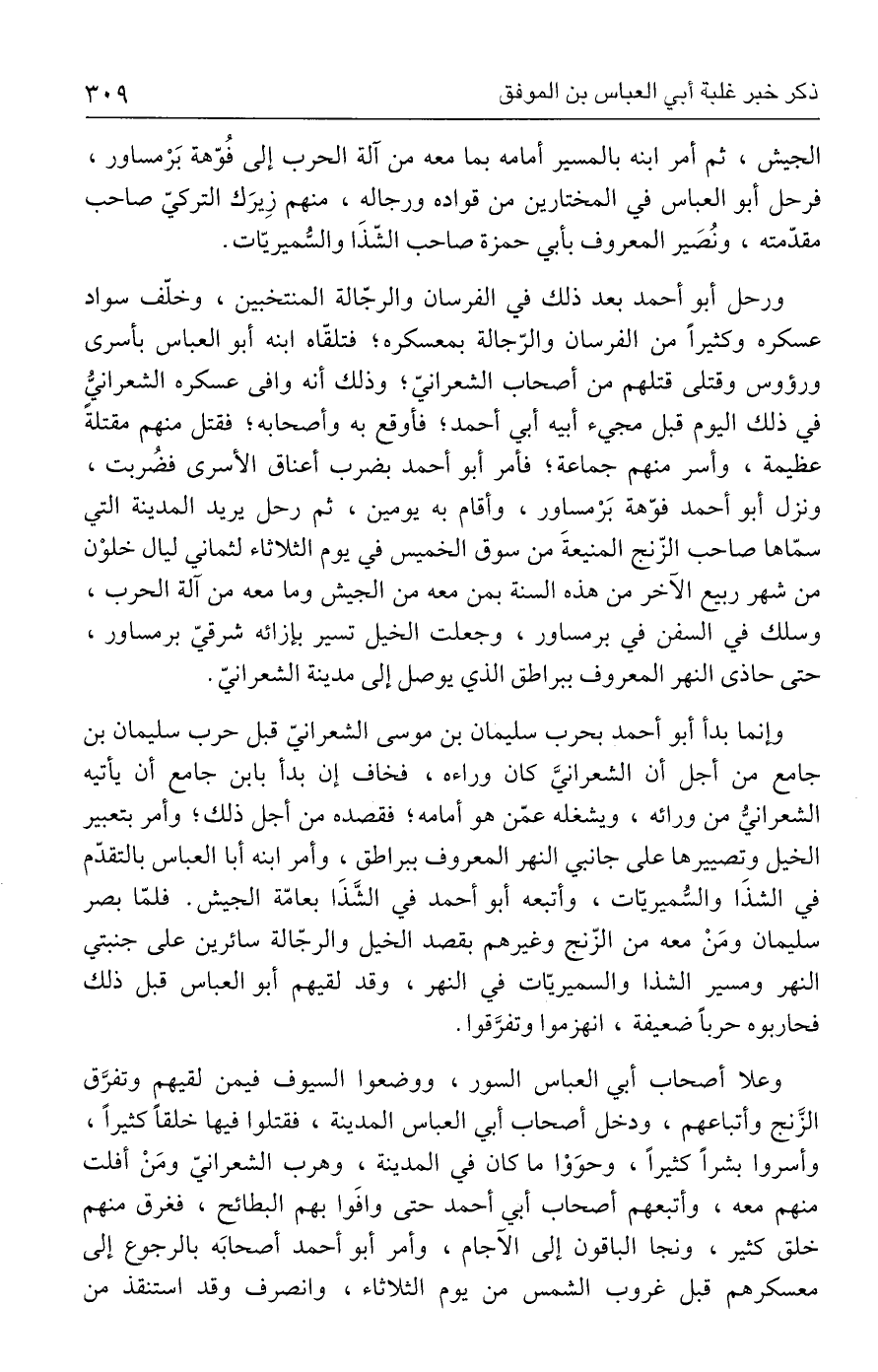 الجيش، ثم أمر ابنه بالمسير أمامه بما معه من آلة الحرب إلى فُوّهة بَرْمساور، فرحل أبو العباس في المختارين من قواده ورجاله، منهم زِيرَك التركيّ صاحب مقدّمته، ونُصَير المعروف بأبي حمزة صاحب الشّذَا والسُّميريّات.