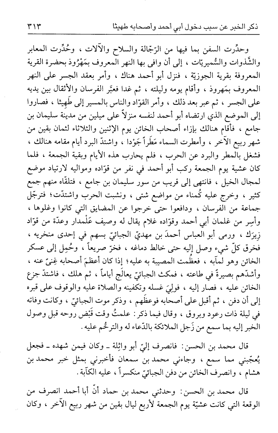 وحدِّرت السفن بما فيها من الرّجّالة والسلاح والآلات، وحُدِّرت المعابر والشَّذوات والسُّميريّات، إلى أن وافى بها النهر المعروف بمَهْرُوذ بحضرة القرية المعروفة بقرية الجوزيّة، فنزل أبو أحمد هناك، وأمر بعقد الجسر على النهر المعروف بمَهروذ، وأقام يومه وليلته، ثم غدا فعبَّر الفرسان والأثقال بين يديه على الجسر، ثم عبر بعد ذلك، وأمر القوّاد والناس بالمسير إلى طَهِيثا، فصاروا إلى الموضع الذي ارتضاه أبو أحمد لنفسه منزلًا على ميلين من مدينة سليمان بن جامع، فأقام هنالك بإزاء أصحاب الخائن يوم الإثنين والثلاثاء لثمان بقين من شهر ربيع الآخر، وأمطرت السماء مَطَرًا جَوْدا، وأشتدّ البرد أيام مقامه هنالك، فشغل بالمطر والبرد عن الحرب، فلم يحارب هذه الأيام وبقية الجمعة، فلما كان عشية يوم الجمعة ركب أبو أحمد في نفر من قوّاده ومواليه لارتياد موضع لمجال الخيل، فانتهى إلى قريب من سور سليمان بن جامع، فتلقّاه منهم جمع كثير، وخرج عليه كُمناء من مواضع شتى، ونشبت الحرب واشتدّت؛ فترجّل جماعة من الفرسان، ودافعوا حتى خرجوا عن المضايق التي كانوا وغلوها، وأسِر من غلمان أبي أحمد وقوّاده غلام يقال له وصيف عَلْمدار وعدّة من قوّاد زِيرَك، ورمى أبو العباس أحمدَ بن مهديّ الجبائيّ بسهم في إحدى منخريه، فخرق كلّ شيء وصل إليه حتى خالط دماغه، فخرّ صريعًا، وحُمِل إلى عسكر الخائن وهو لمآبه، فعظُمت المصيبة به عليه؛ إذا كان أعظمَ أصحابه غِنىً عنه، وأشدّهم بصيرةً في طاعته، فمكث الجبائيّ يعالَج أيامًا، ثم هلك، فاشتدّ جزع الخائن عليه، فصار إليه، فولِيَ غسله وتكفينه والصلاة عليه والوقوف على قبره إلى أن دفن، ثم أقبل على أصحابه فوعظَهم، وذكر موت الجبائيّ، وكانت وفاته في ليلة ذات رعود وبروق، وقال فيما ذكر: علمتُ وقت قَبْض روحه قبل وصول الخبر إليه بما سمع من زَجل الملائكة بالدّعاء له والترحُّم عليه.