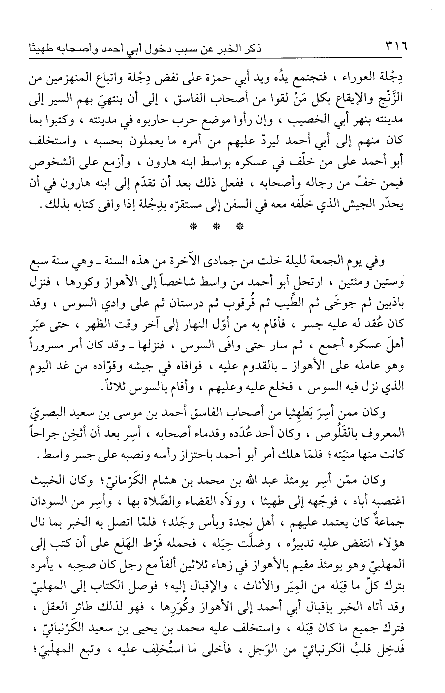 وكان ممّن أسِر يومئذ عبد الله بن محمد بن هشام الكَرْمانيّ؛ وكان الخبيث اغتصبه أباه، فوجّهه إلى طهيثا، وولّاه القضاء والصَّلاة بها، وأسِر من السودان جماعةٌ كان يعتمد عليهم، أهل نجدة وبأس وجَلد، فلمّا اتصل به الخبر بما نال هؤلاء انتقض عليه تدبيرُه، وضلَّت حِيَله، فحمله فَرْط الهَلع على أن كتب إلى المهلبيّ وهو يومئذ مقيم بالأهواز في زهاء ثلاثين ألفًا مع رجل كان صحِبه، يأمره بترك كلّ ما قِبَله من المِيَر والأثاث، والإقبال إليه؛ فوصل الكتاب إلى المهلبيّ وقد أتاه الخبر بإقبال أبي أحمد إلى الأهواز وكُوَرِها، فهو لذلك طائر العقل، فترك جميع ما كان قِبَله، واستخلف عليه محمد بن يحيى بن سعيد الكَرْنبائيّ، فَدخِل قلبُ الكرنبائيّ من الوَجل، فأخلى ما استُخلِف عليه، وتبع المهلّبيّ؛