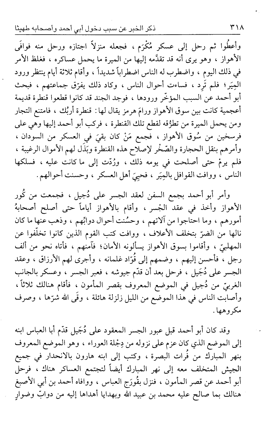 وأمر أبو أحمد بجمع السفن لعقد الجسر على دُجيل، فجمعت من كُور الأهواز وأخذ في عقد الجْسر، وأقام بالأهواز أيامًا حتى أصلح أصحابهُ أمورهم، وما احتاجوا من آلاتهم، وحسُنت أحوال دوابِّهم، وذهب عنها ما كان نالها من الضرّ بتخلف الأعلاف، ووافت كتب القوم الذين كانوا تخلّفوا عن المهلبيّ، وأقاموا بسوق الأهواز يسألونه الأمان؛ فآمنهم، فأتاه نحو من ألف رجل، فأحسن إليهم، وضمهم إلى قُوّاد غلمانه، وأجرى لهم الأرزاق، وعقد الجسر على دُجَيل، فرحل بعد أن قدّم جيوشه، فعبر الجسر، وعسكر بالجانب الغربيّ من دُجيل في الموضع المعروف بقصر المأمون، فأقام هنالك ثلاثًا، وأصابت الناس في هذا الموضع من الليل زلزلة هائلة، وقَى الله شرّها، وصرف مكروهها.