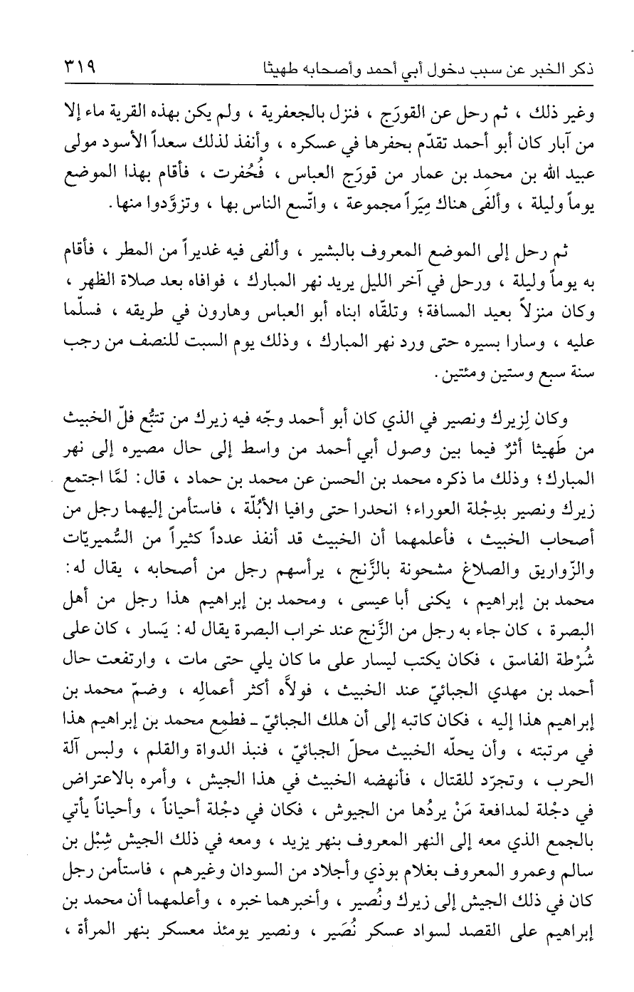 ثم رحل إلى الموضع المعروف بالبشير، وألفى فيه غديرًا من المطر، فأقام به يومًا وليلة، ورحل في آخر الليل يريد نهر المبارك، فوافاه بعد صلاة الظهر، وكان منزلًا بعيد المسافة؛ وتلقّاه ابناه أبو العباس وهارون في طريقه، فسلّما عليه، وسارا بسيره حتى ورد نهر المبارك، وذلك يوم السبت للنصف من رجب سنة سبع وستين ومئتين.